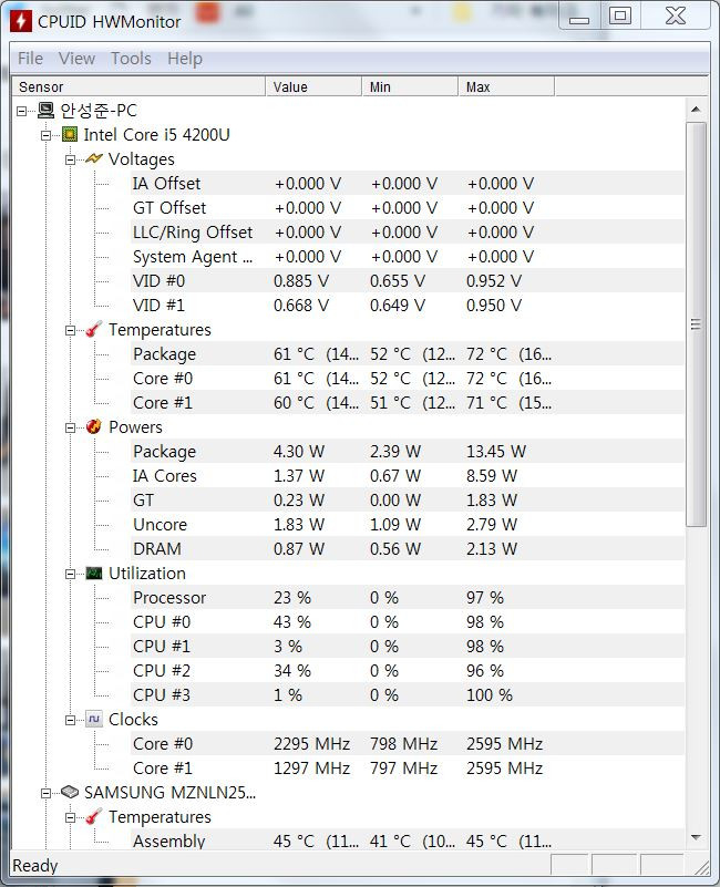참고로 온도측정은 흔히 사용하는 Hwmonitor프로그램을 사용하였습니다.