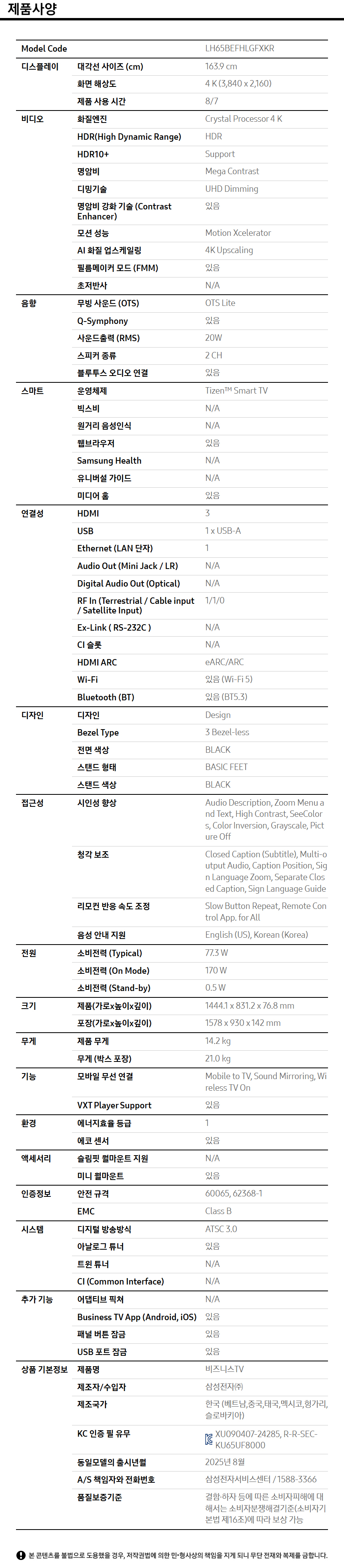 삼성전자 LH65BEFHLGFXKR 163.9cm(65인치) LED 4K UHD TV 에너지효율 1등급 스탠드형 - 비지니스 TV -