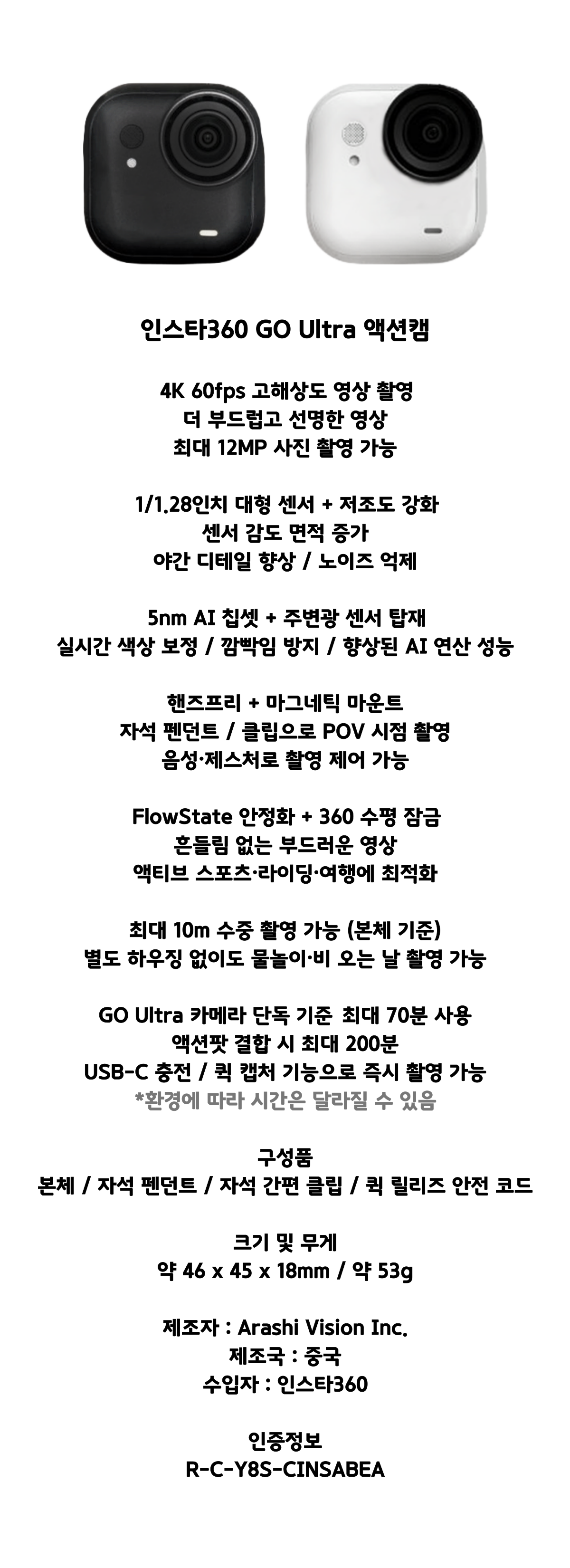 인스타360 GO Ultra 표준 번들 미니 액션캠 블랙