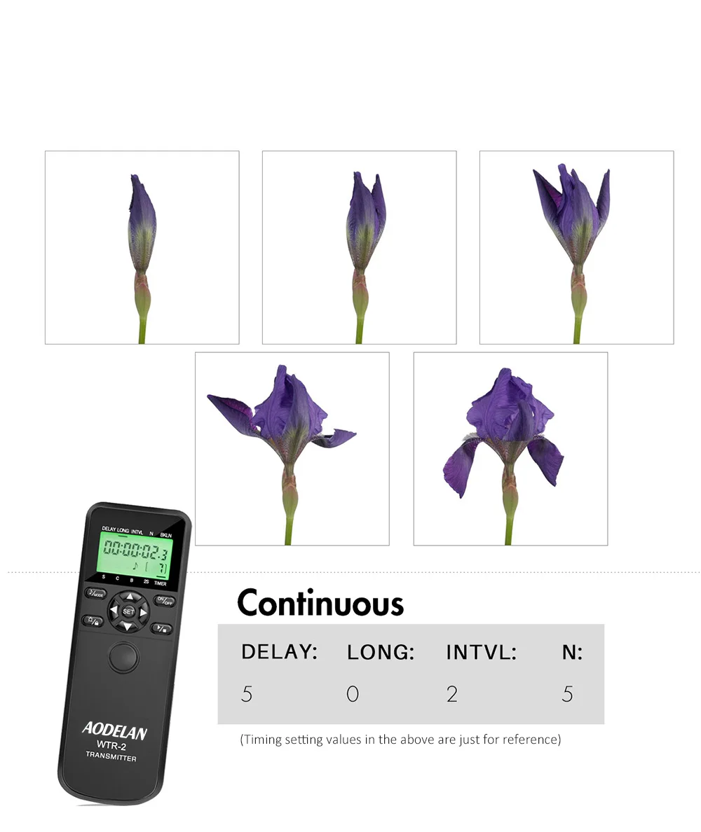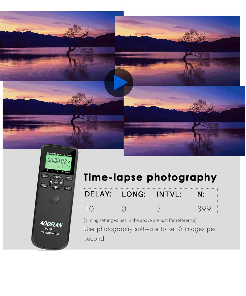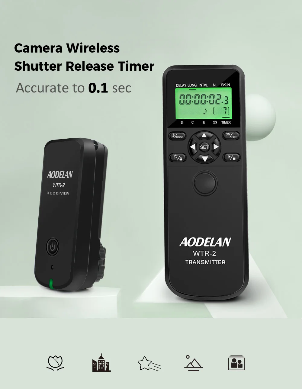 2. AODELAN Camera remote control supports multiple TIMER mode and SHUTTER RELEASE mode: Single shooting ,continuous shooting, bulb exposure and 2 second delay modes are available for shutter release mode. Delay ,long exposure ,interval and exposure ?count settings are available for timer control.