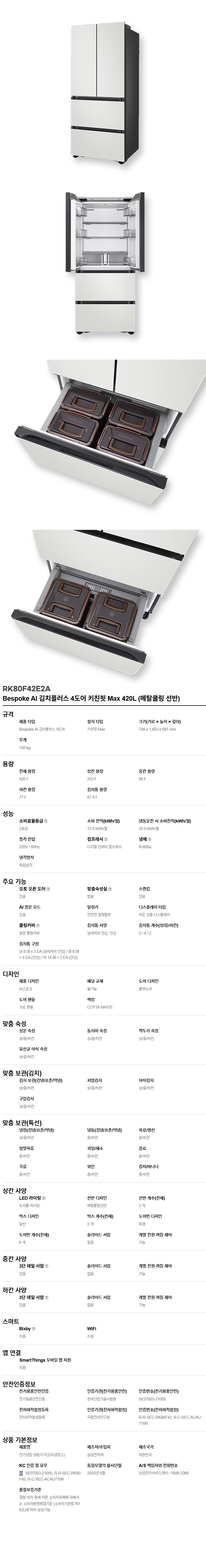삼성 RK80F42E2A 김치플러스 4도어 키친핏 Max 420L 코타화이트 메탈쿨링 선반