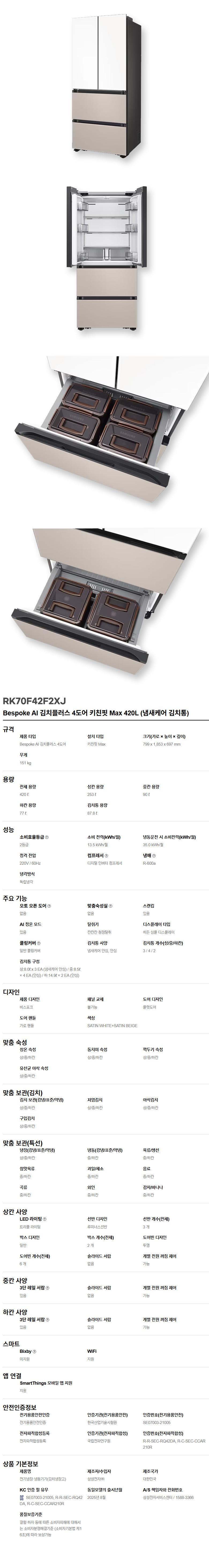 삼성 RK70F42F2XJ 김치플러스 4도어 키친핏 Max 420L 냄새케어 김치통 새틴