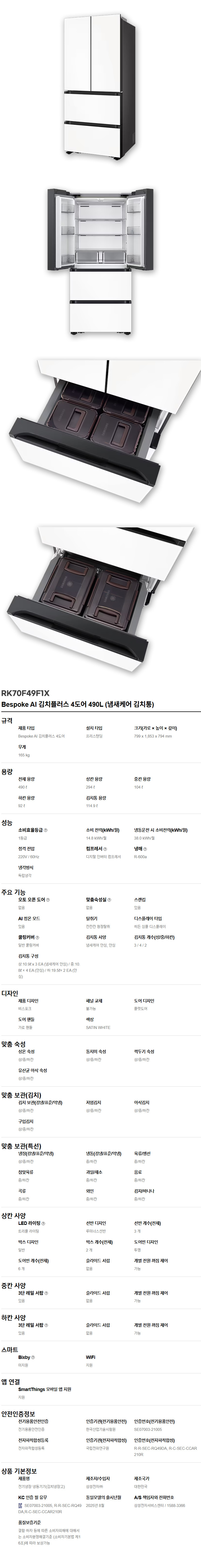 삼성 RK70F49F1X 김치플러스 4도어 490L 새틴화이트 냄새케어 김치통 포함
