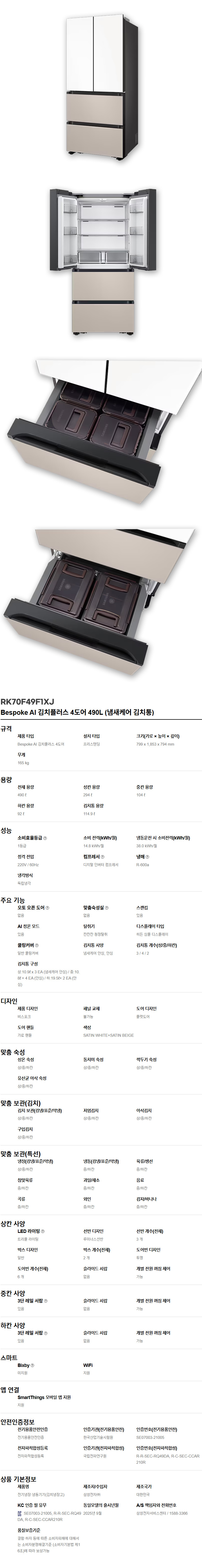 삼성 RK70F49F1XJ 김치플러스 4도어 490L 새틴 화이트 베이지 냄새케어 김치통