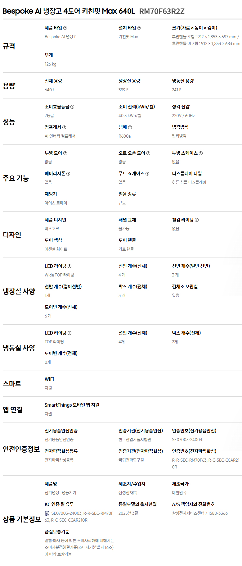 삼성 RM70F63R2Z 25년형 4도어 키친핏 Max 640L 에센셜 화이트 기본설치비포함