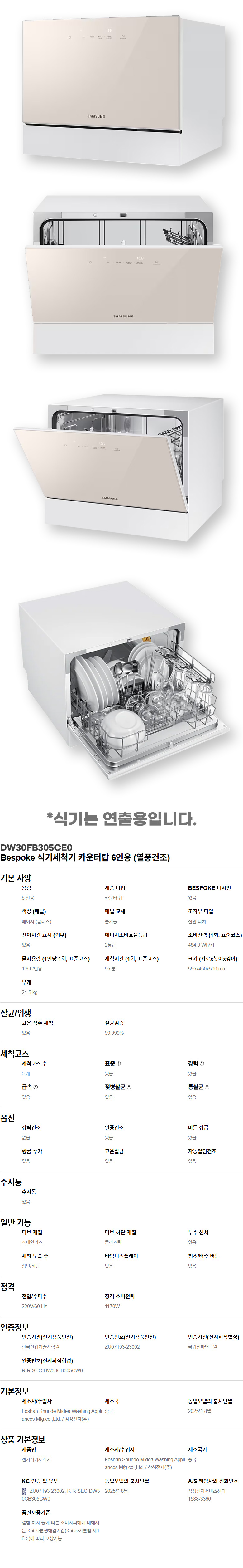 삼성 DW30FB305CE0 25년형 비스포크 식기세척기 카운터탑 6인용 열풍건조 베이지