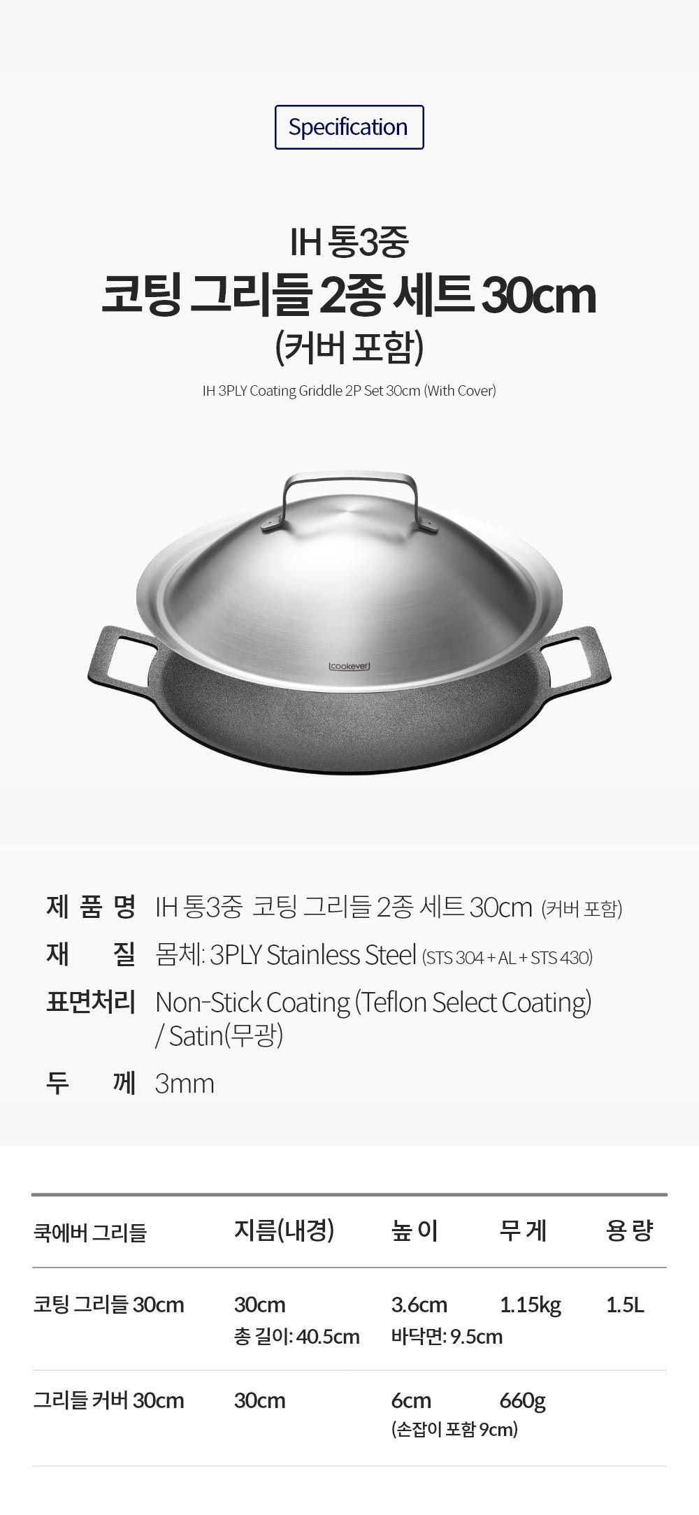 쿡에버 IH 인덕션 통3중 코팅 그리들 2종 세트 30cm (커버포함)