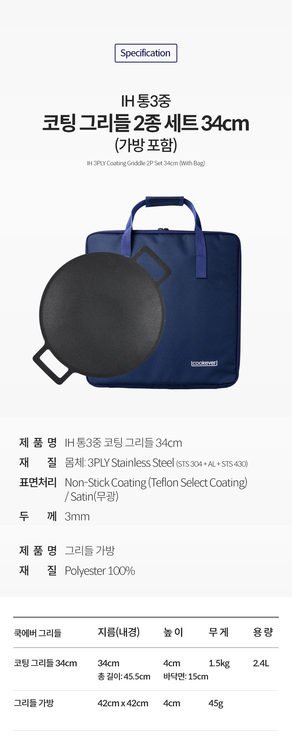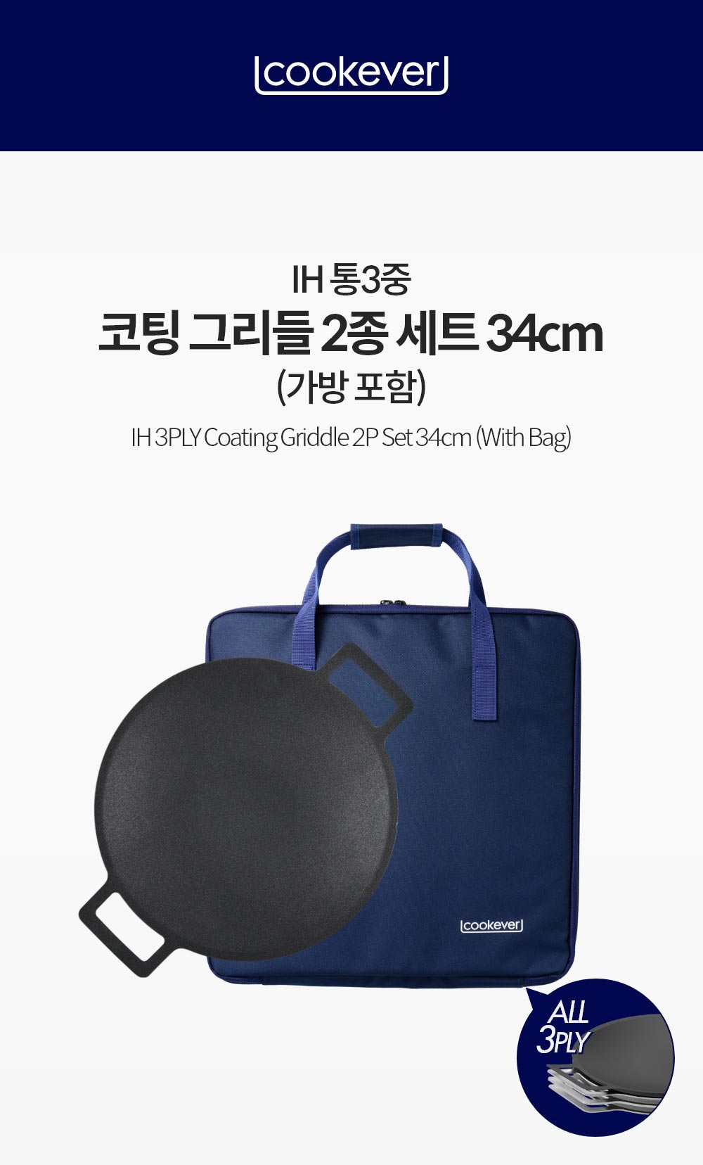 쿡에버 IH 인덕션 통3중 코팅 그리들 2종 세트 34cm (가방포함)