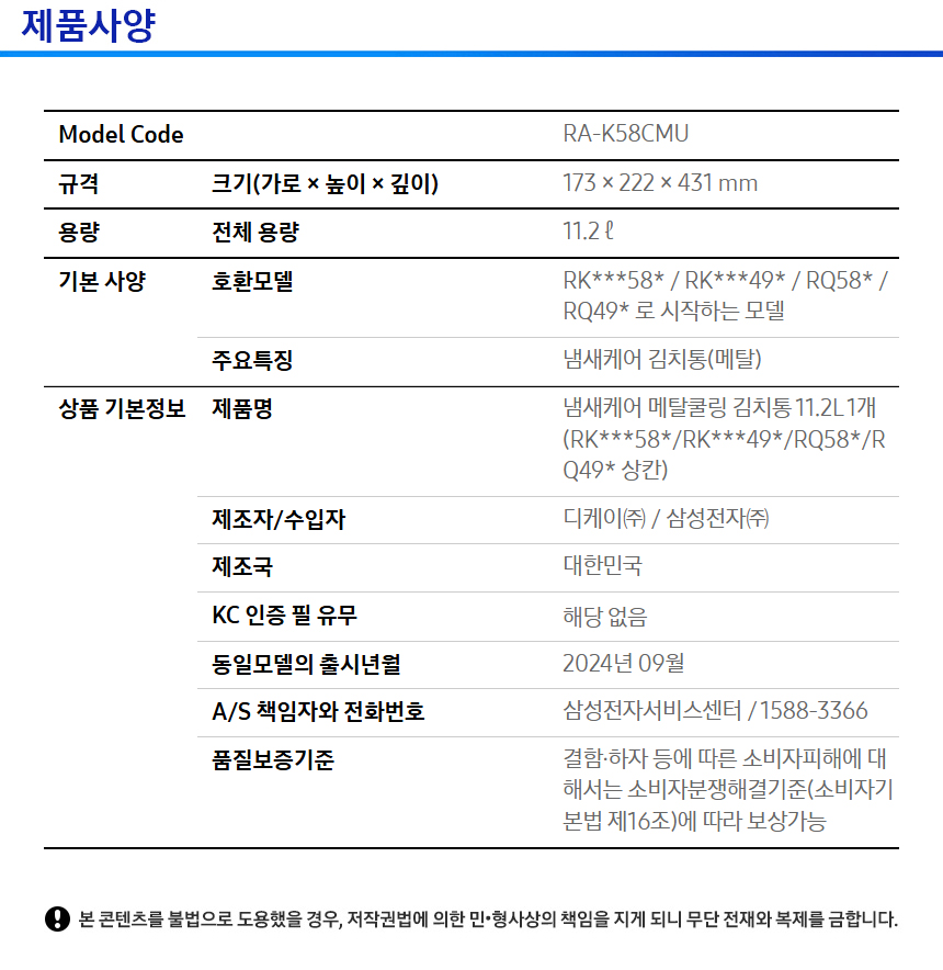 냄새케어 메탈쿨링 김치통 RA-K58CMU 11.2L