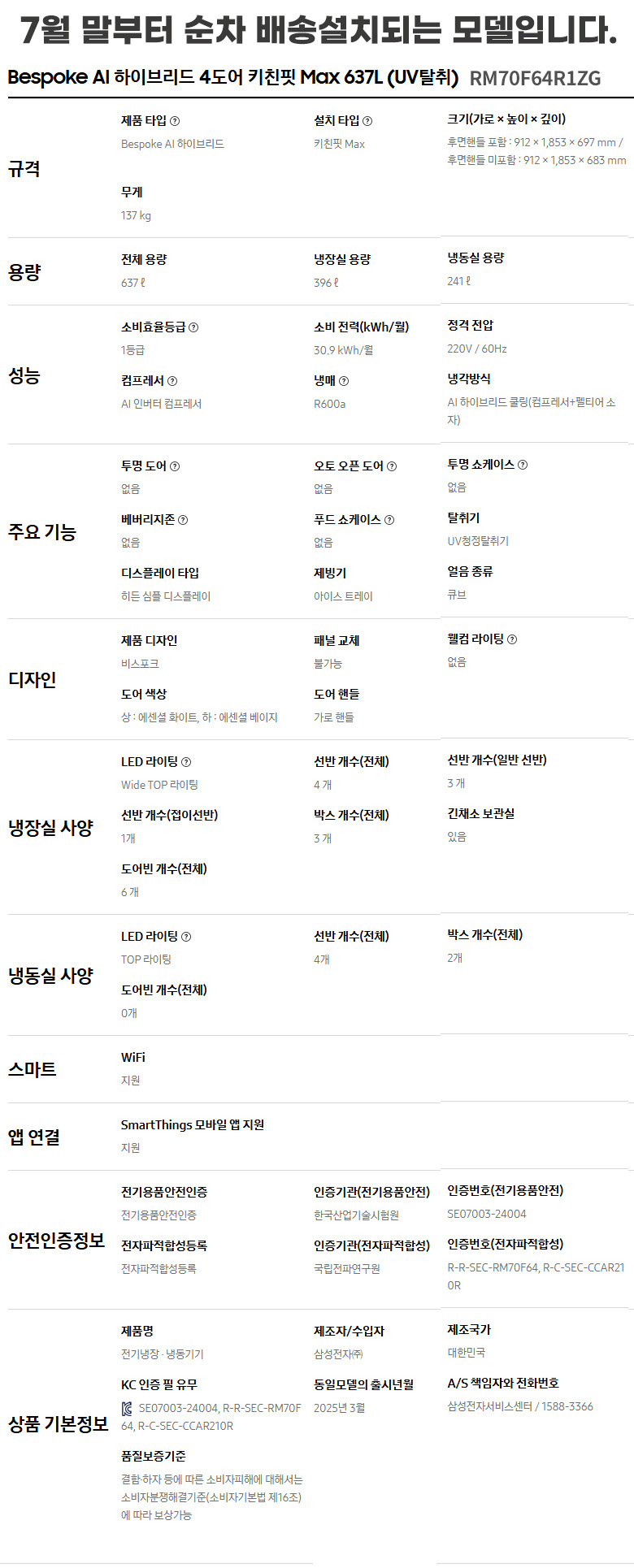 삼성 RM70F64R1ZG 25년형 하이브리드 4도어 키친핏 Max 637L UV탈취 기본...