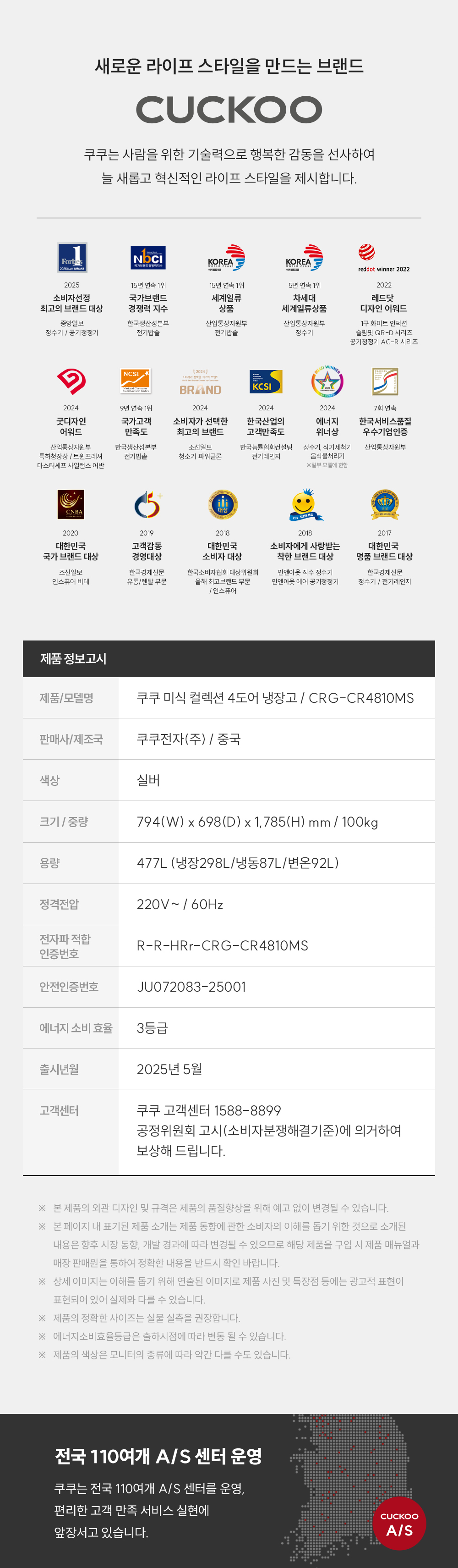 쿠쿠 미식컬렉션 4도어 냉장고 CRG-CR4810MS / 용량 477L / 실버