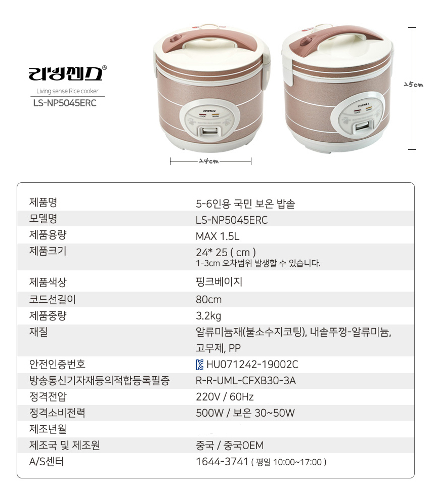 원터치 비압력 일반밥솥/리빙센스 전기보온밥솥 5~6인용/LS-NP5045ERC