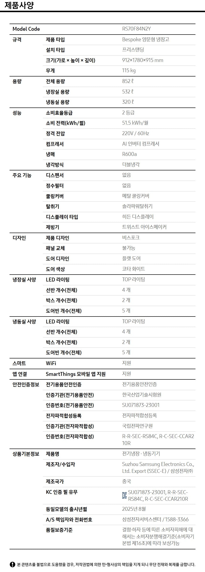 (현대Hmall)삼성 비스포크 양문형 냉장고 852L 코타화이트 RS70F84N2Y