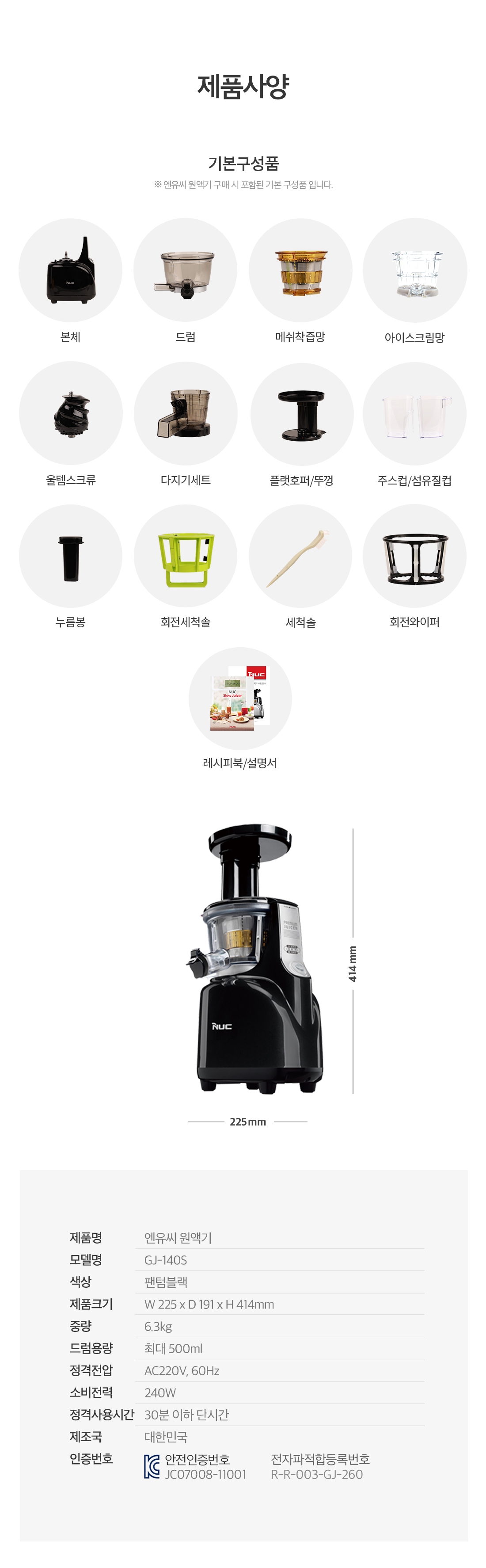 엔유씨 슬로우주서 원액기 착즙기 GJ-140S 팬텀블랙/국산 착즙기/여름 주스 제조