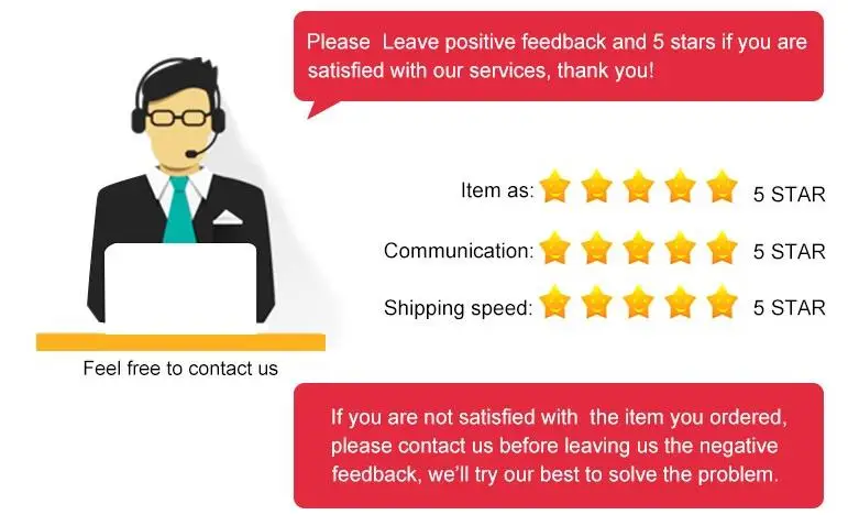 우리는 우수성의 높은 기준을 유지하고 100% 고객 만족을 위해 노력합니다! 피드백은 매우 중요합니다. 당사는 귀하의 우려 사항을 만족스럽게 해결할 수 있도록 중립적이거나 부정적인 피드백을 제공하기 전에 즉시 당사에 연락해 주시기 바랍니다.