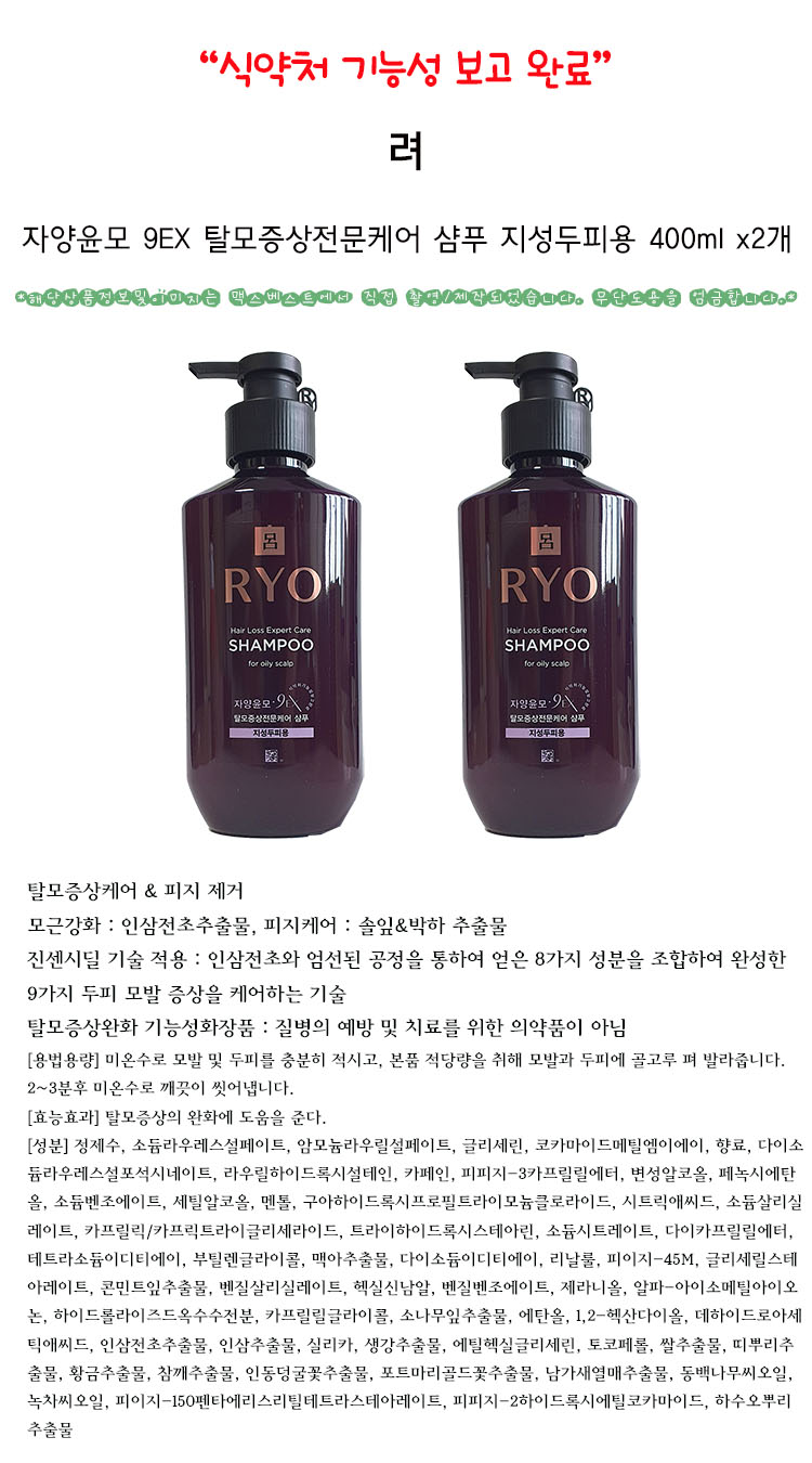 려 자양윤모 9EX 탈모증상전문케어 샴푸 지성두피용 400ml x2개