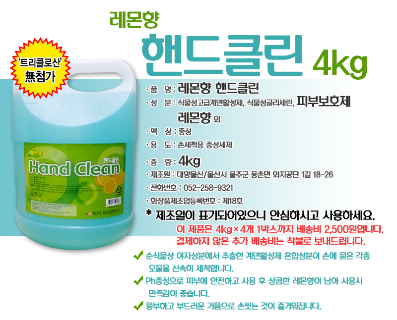 핸드클린 핸드워시 레몬향 리필 4Kg 대용량 손세정제 물비누 핸드워시 업소용