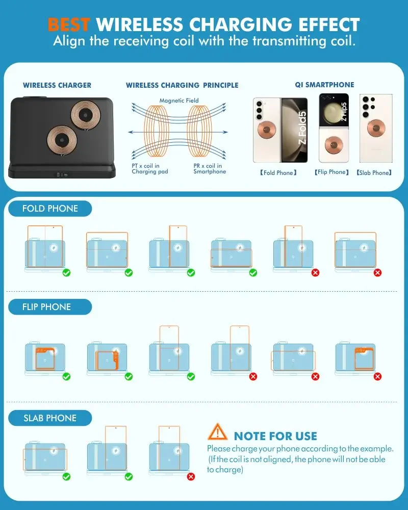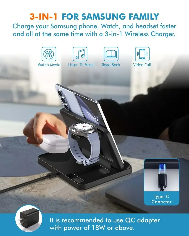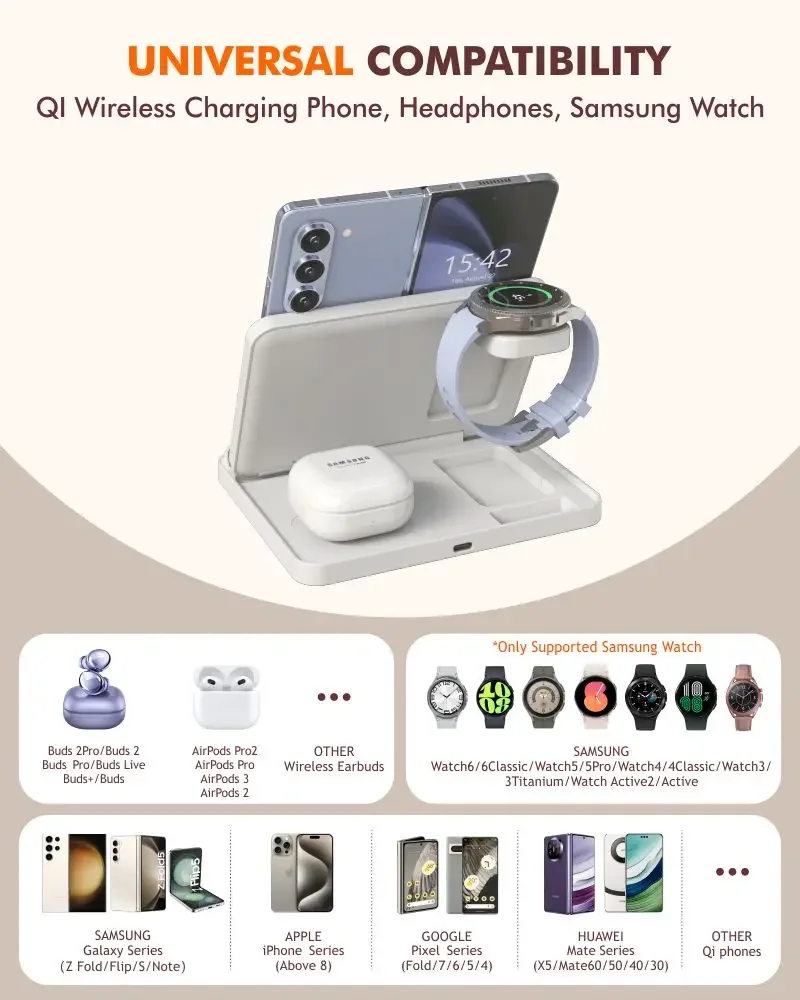 【삼성 사용자를위한 완벽한 선택】3 in 1 충전소 삼성은 삼성 기기 용으로 특별히 설계되었습니다. 갤럭시 Z 플립/Z 플립 5G/Z 플립 3/Z 플립 4/Z 폴드/Z 폴드 2/Z 폴드 3/Z 폴드 4 의 안드로이드 충전 스테이션을 대체 할 수 있습니다. 갤럭시 S23 S22 울트라/S21/S20/S10/S10e/S10 +/S9/S9 +, 갤럭시 노트 20/10/10 +/9/8, 갤럭시 버드/버드 +/버드 프로/라이브, 에어 팟 2/3/프로. (참고: 무선 충전 케이스가 있는 이어버드만 지원)