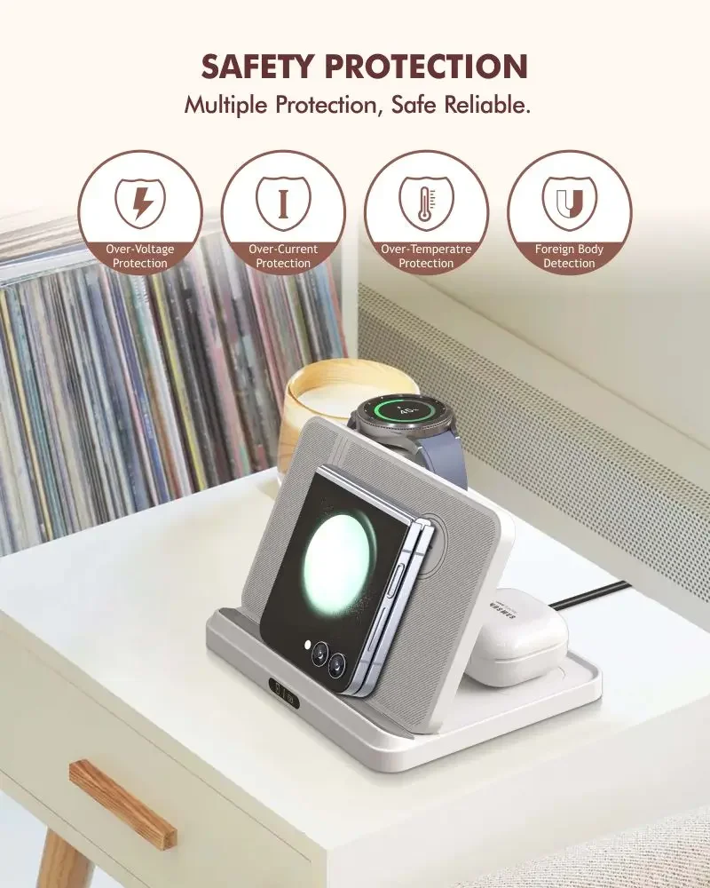 【울트라 세이프 삼성 충전소】지능형 보호 기술 및 신뢰성 및 하이 퀄리티 설계. 과열 보호, 과전압 보호, 과전류 보호 및 이물질 감지 기능과 같은 다중 보호 기능을 제공합니다. 이 3 in 1 삼성 충전소에는 각 충전기 뒷면에 열 방출 구멍이 있어 삼성 휴대폰을 안정적이고 안전하게 충전 할 수 있습니다.