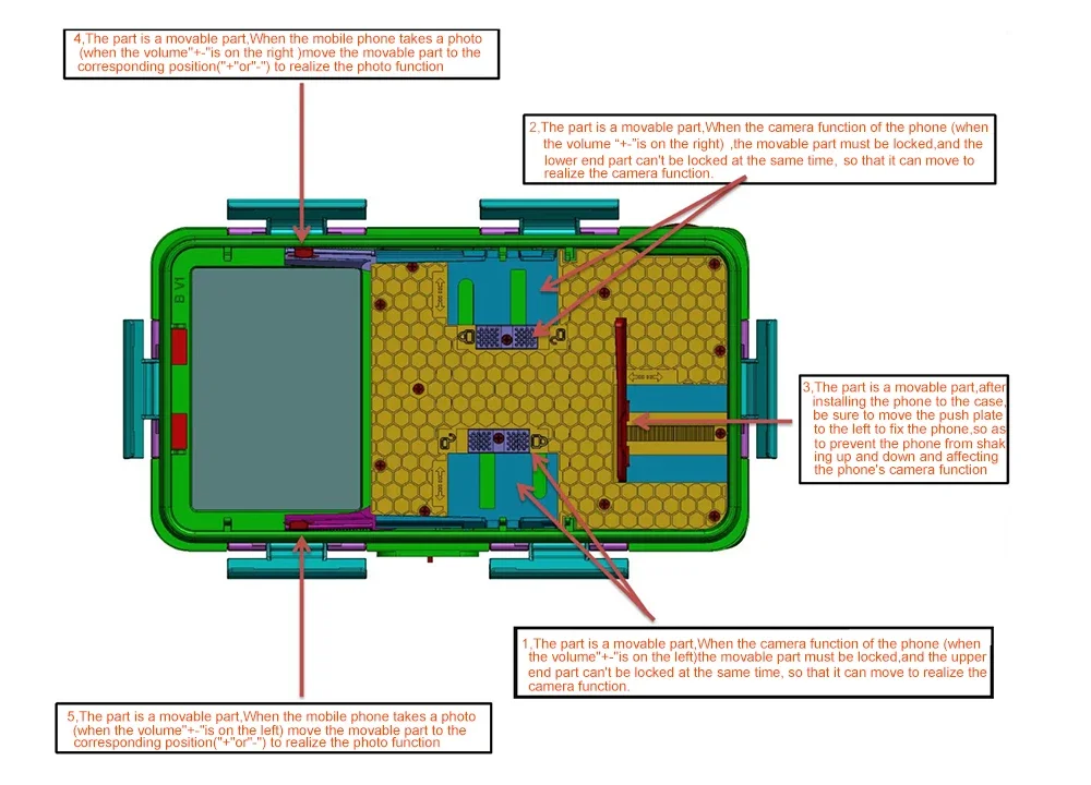 5, 부품은 움직일 수있는 부분입니다. 휴대 전화가 사진을 찍을 때 (볼륨 "+-" 가 왼쪽에있을 때) 사진 기능을 실현하기 위해 움직일 수있는 부분을 해당 위치 ("+" 또는 "-") 로 이동하십시오.