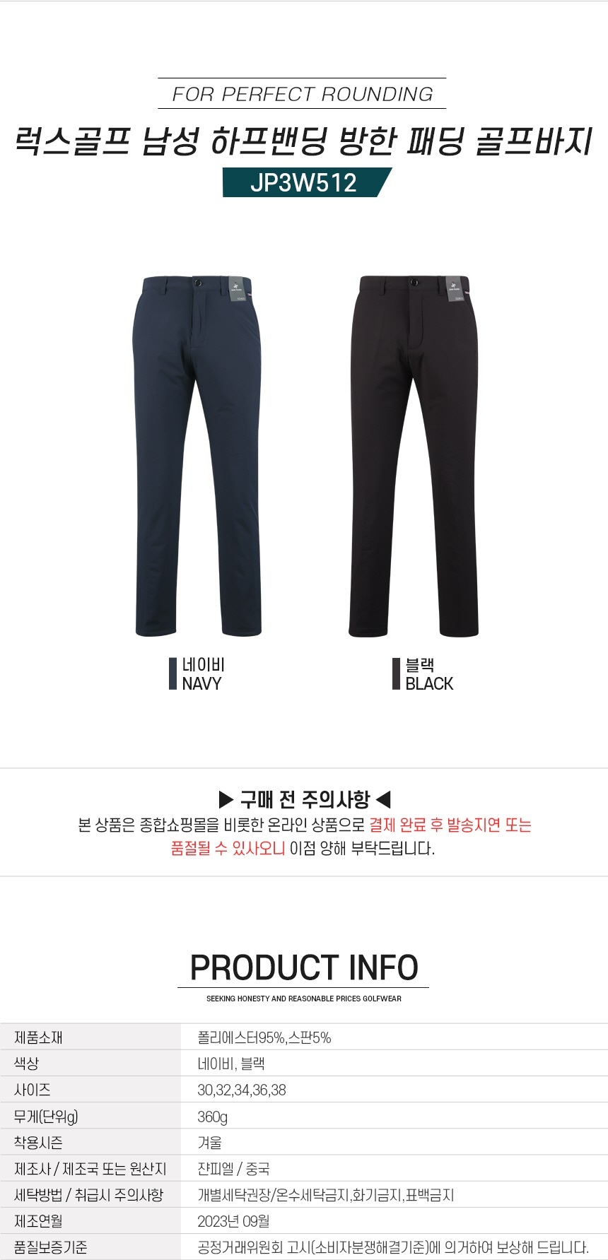 남성 겨울 골프웨어 반밴딩 방한 캐주얼 패딩 골프바지 L302308