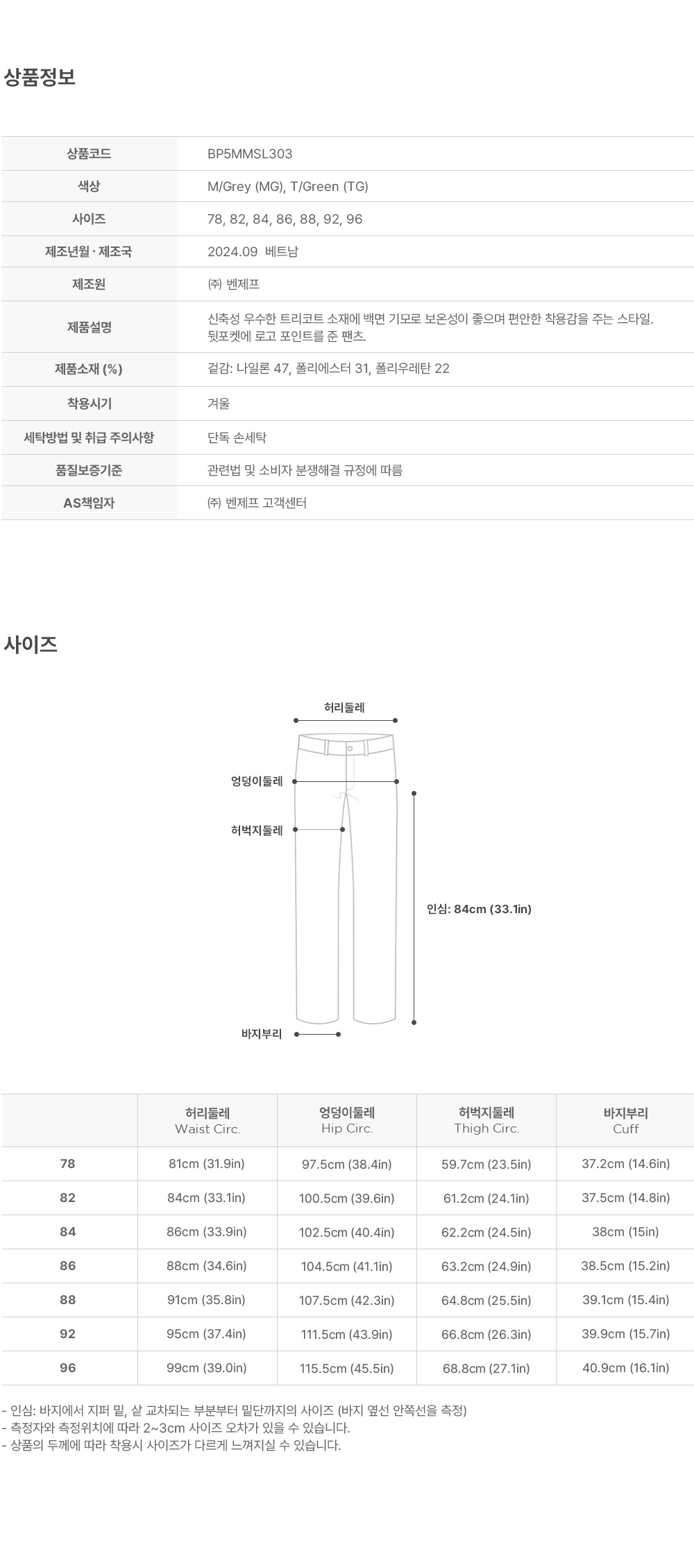 벤제프 하프클럽/BP5MMSL303 남성 트리코트 기모 팬츠