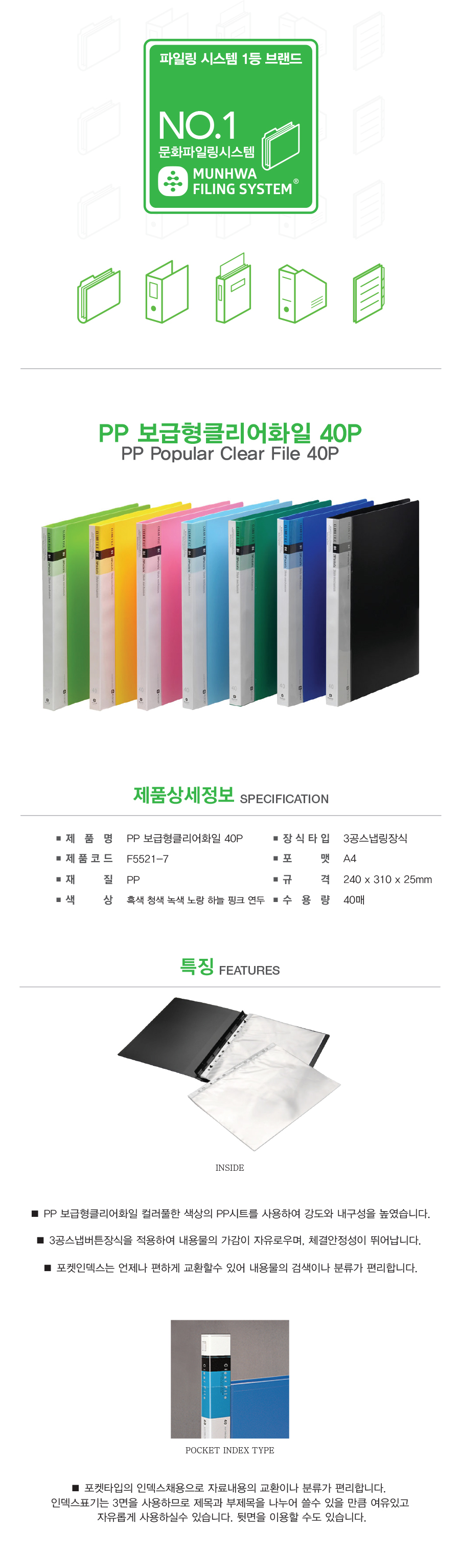 인덱스 클리어화일 A4 40매 친환경 흑색 F5521-7 문화산업