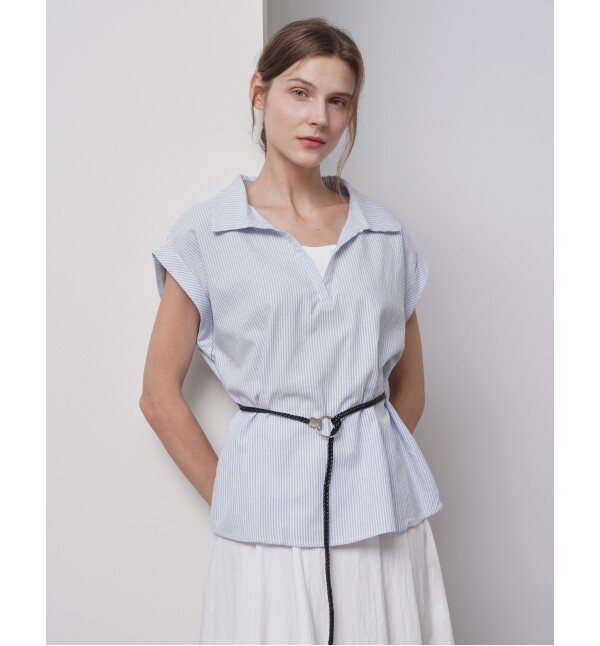 탱커스스트라이프 벨트 세트 레이어드 카라 반팔 블라우스 (TX2BL064L0)