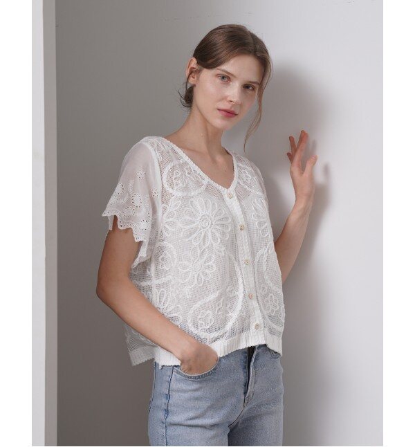 탱커스플라워 자수 브이넥 버튼 펀칭 반팔 블라우스 (TX2BL052L0)