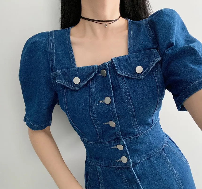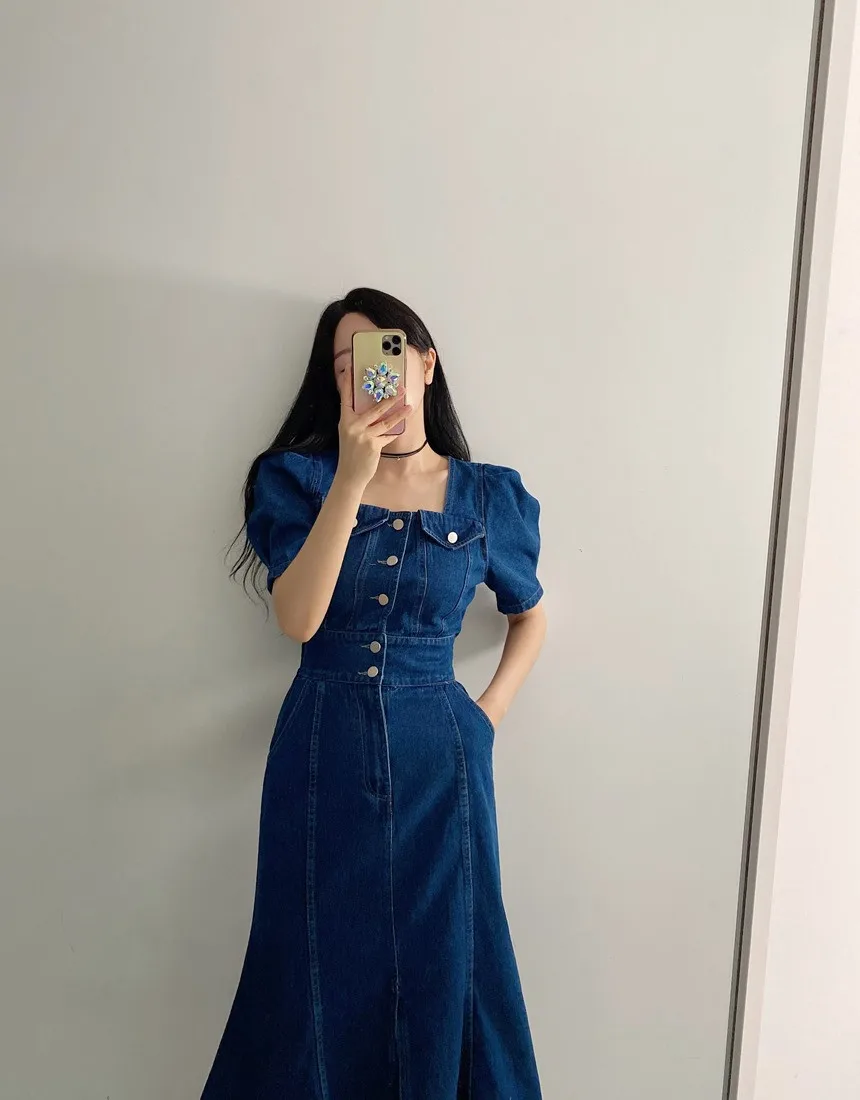 니트 원피스 하객룩 롱원피스 데님 중간 길이 사각 칼라 분할 스커트 슬리밍 여름 드레스 여성 피쉬 테일