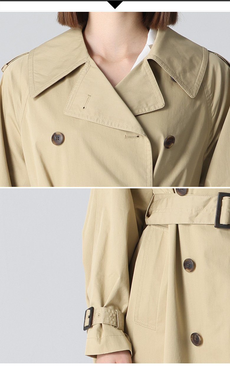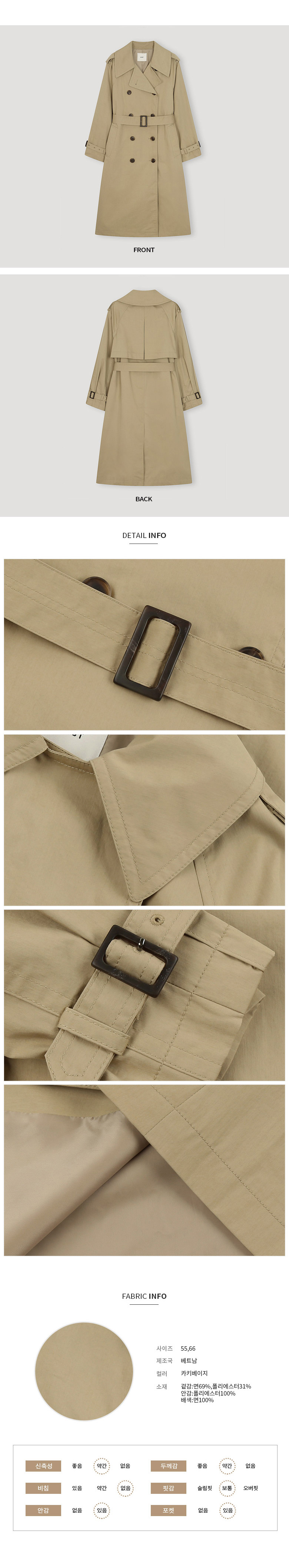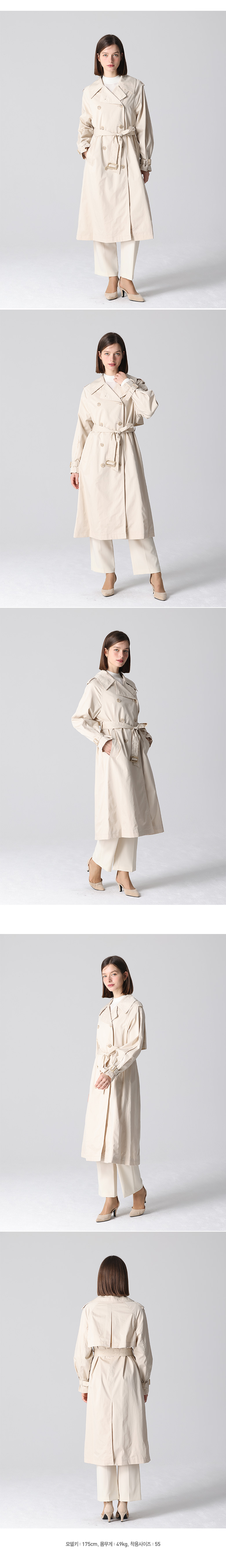 코튼 소재는 무겁지 않지만, 트렌치코트 특유의 디자인과 구조 덕분에 고급스러운 느낌을 자아냅니다.