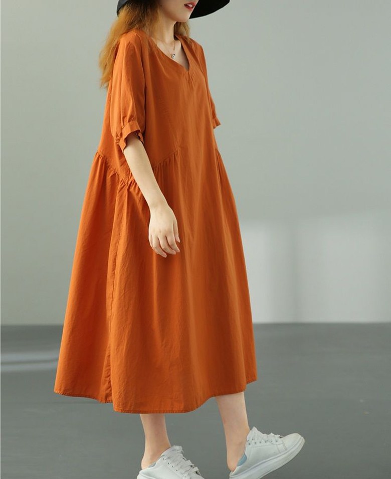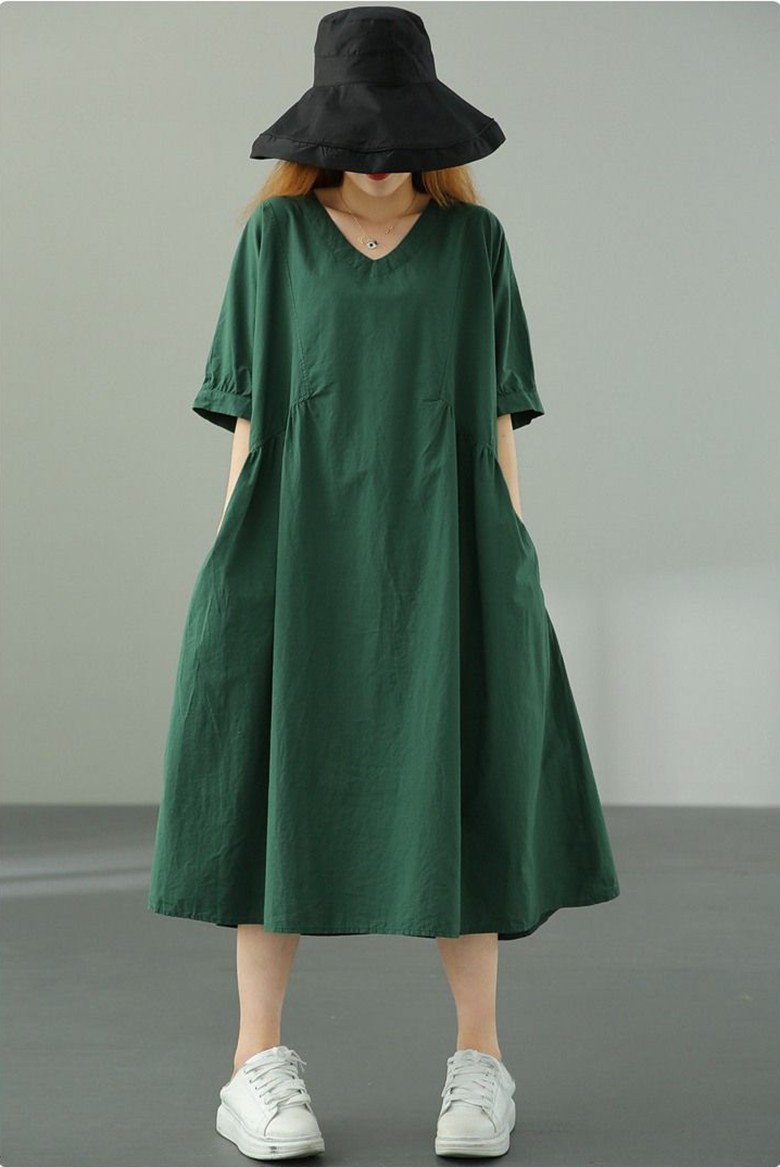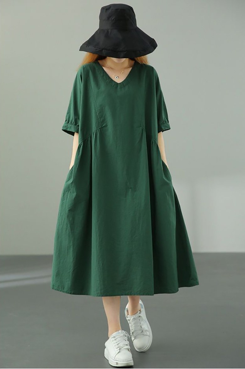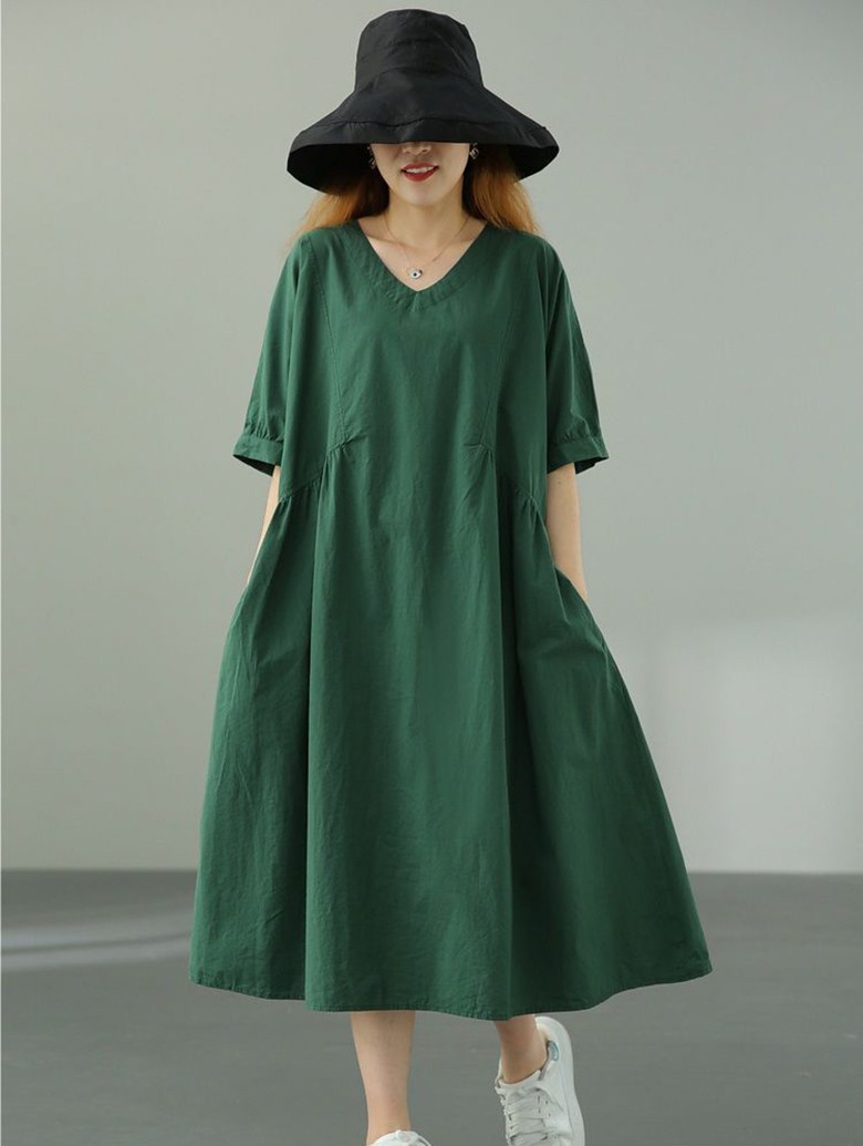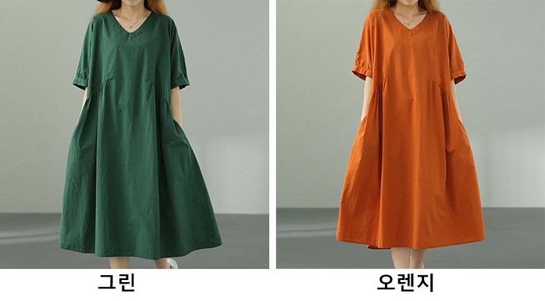 여름 중년 여성 빅 사이즈 브이넥 반팔 솔리드 원피스 포켓 오버핏 스커트
