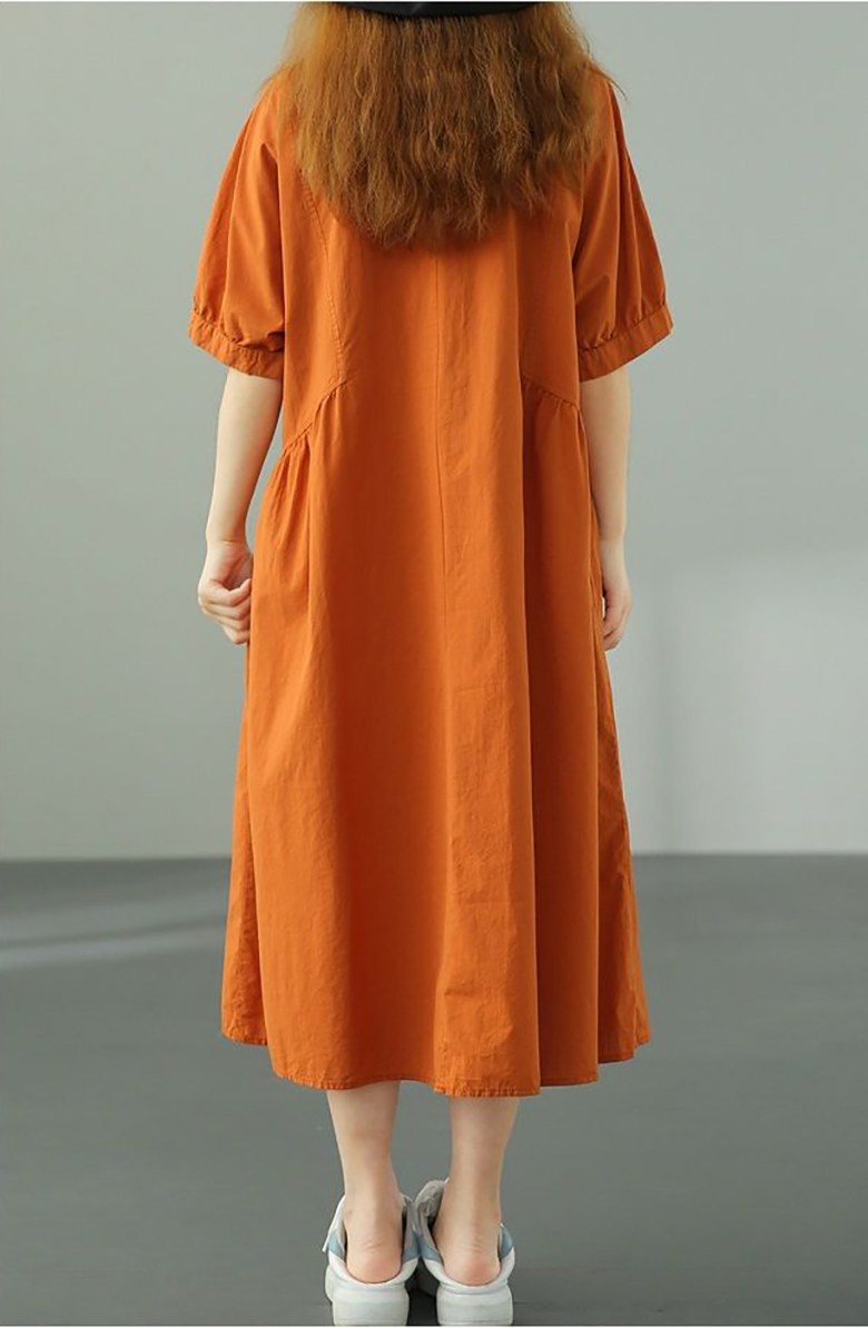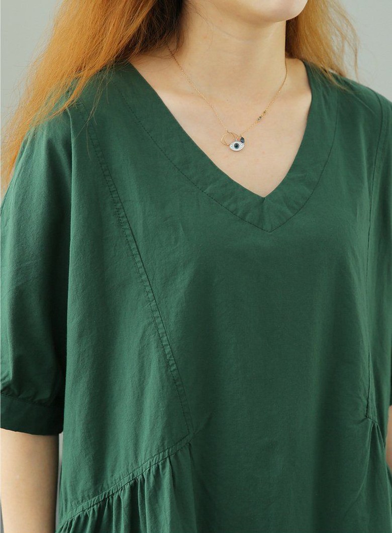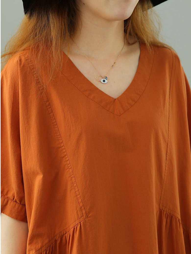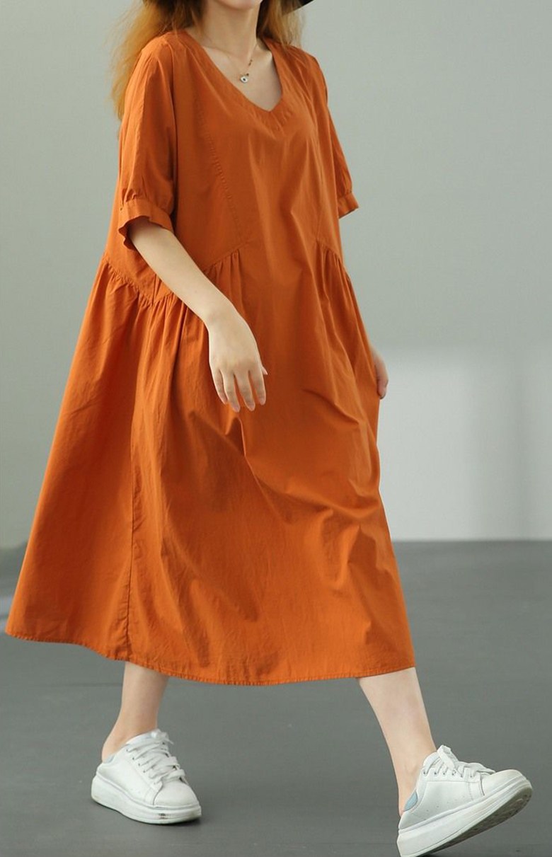 여름 중년 여성 빅 사이즈 브이넥 반팔 솔리드 원피스 포켓 오버핏 스커트