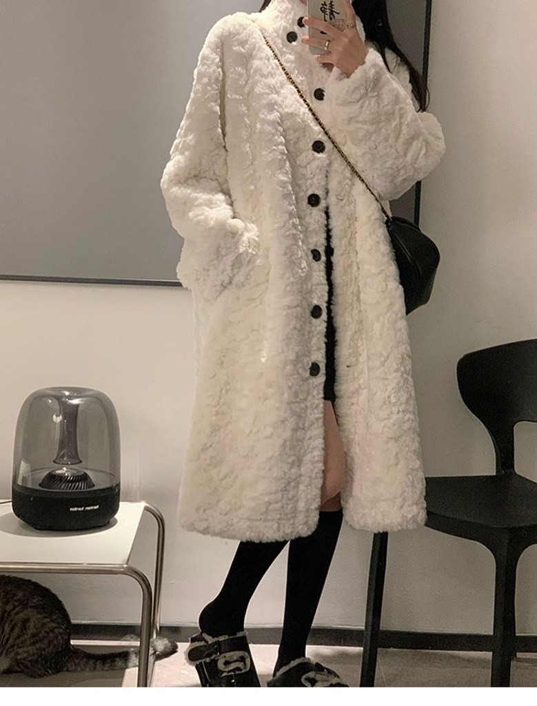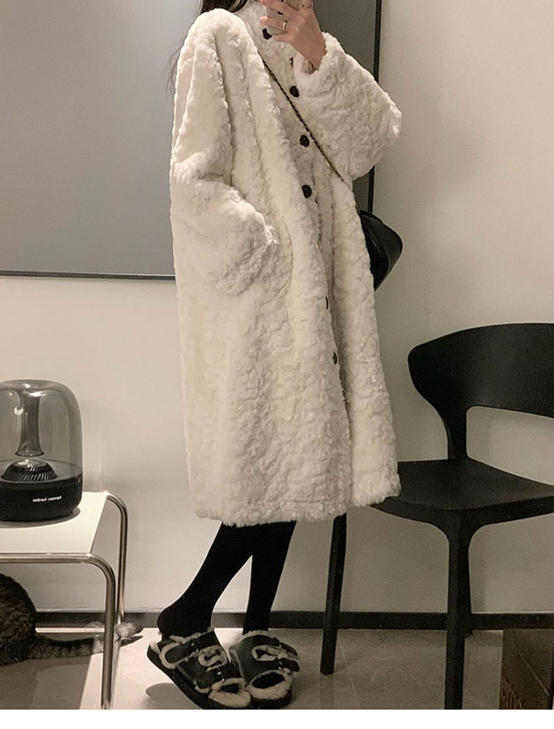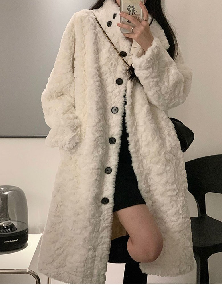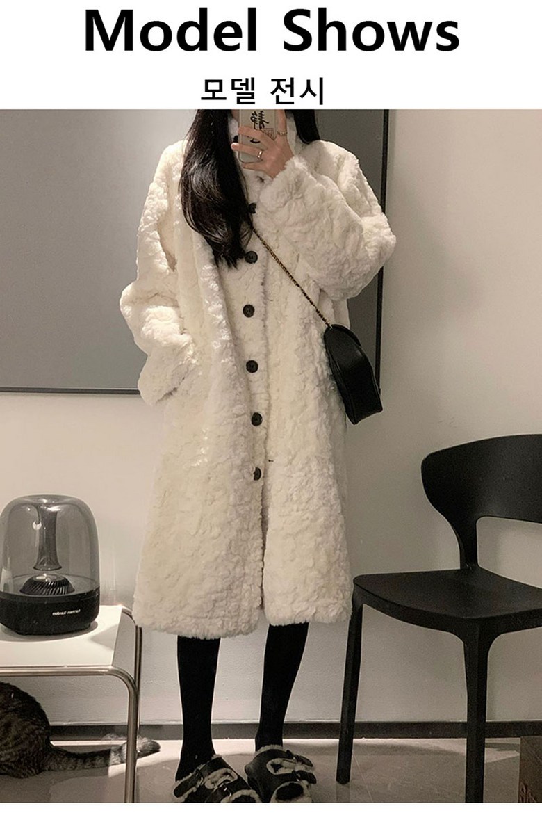 여성 루즈핏 버튼 스탠드 칼라 따뜻한 롱 도톰 램스울 코트