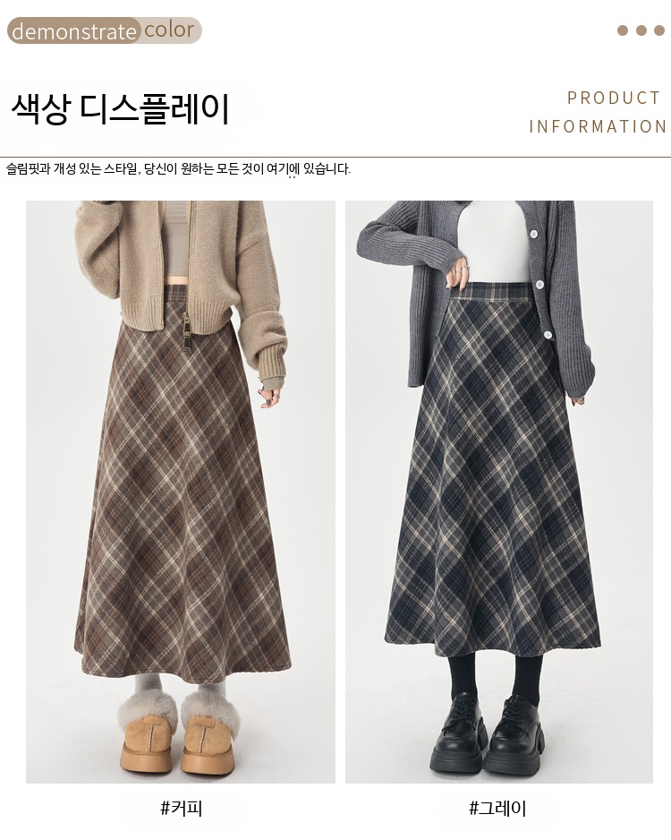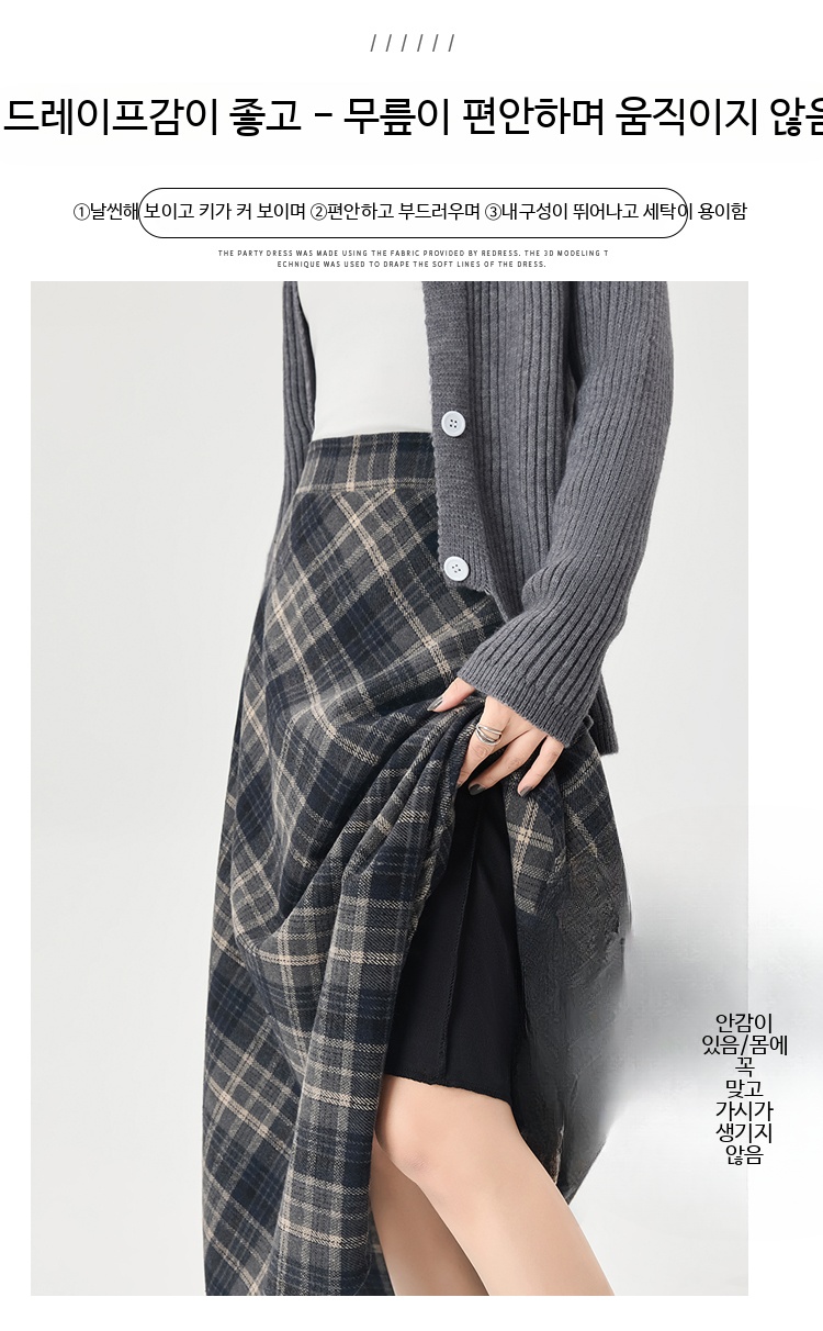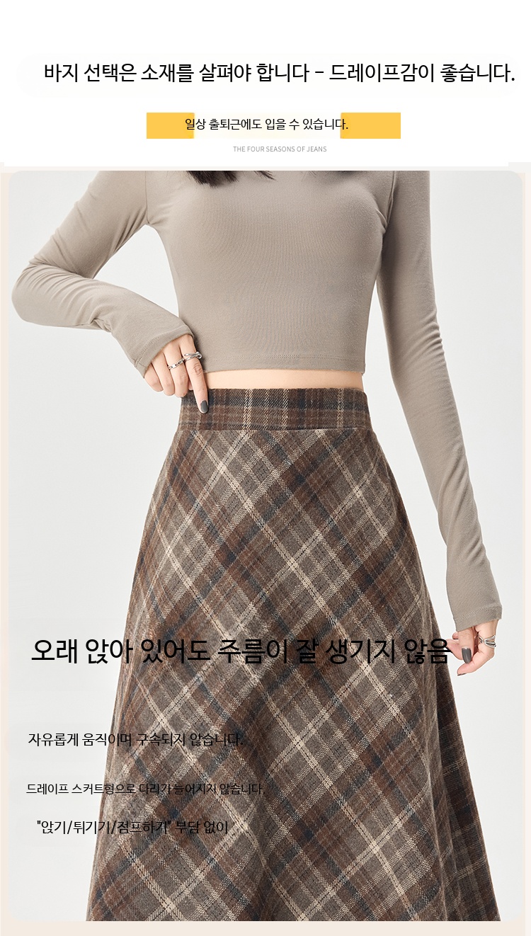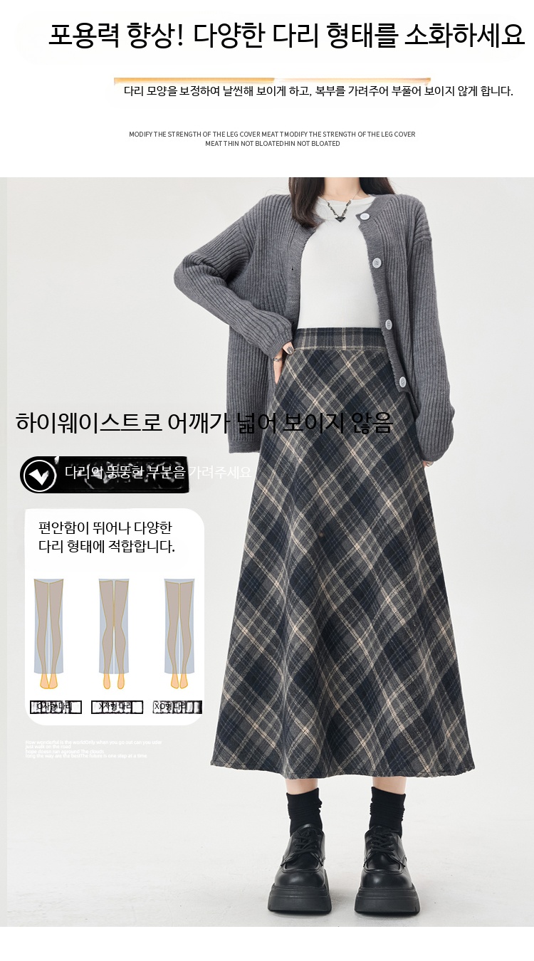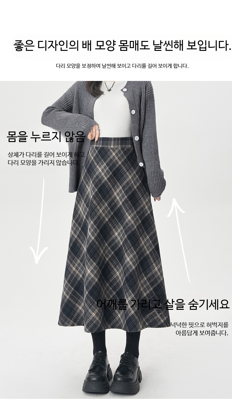 여성 A라인 플레어 모직 롱스커트 가을 겨울용 체형커버 하이웨이스트 체크스커트