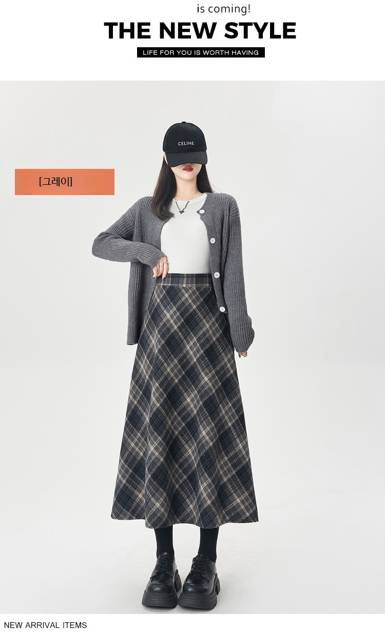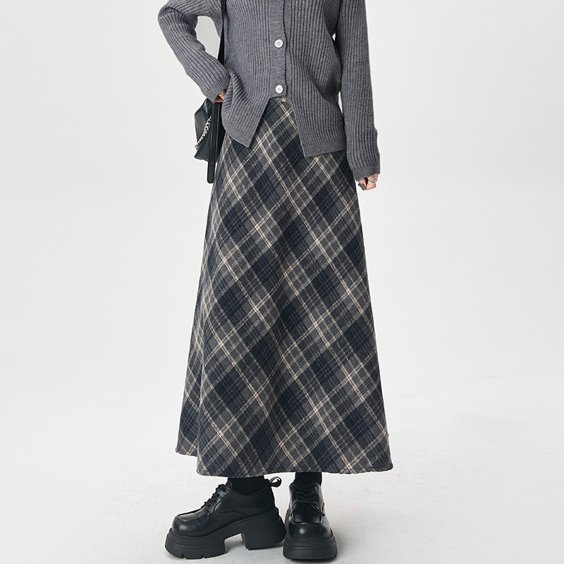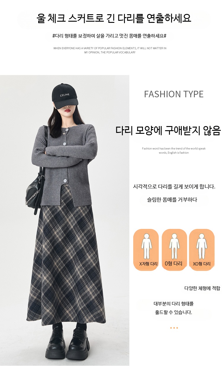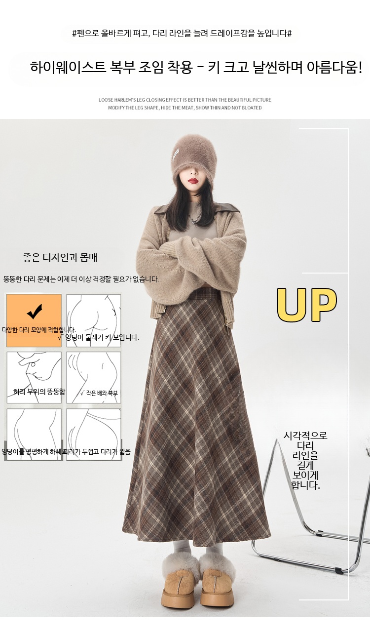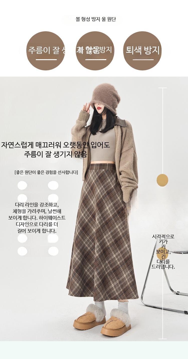 여성 A라인 플레어 모직 롱스커트 가을 겨울용 체형커버 하이웨이스트 체크스커트