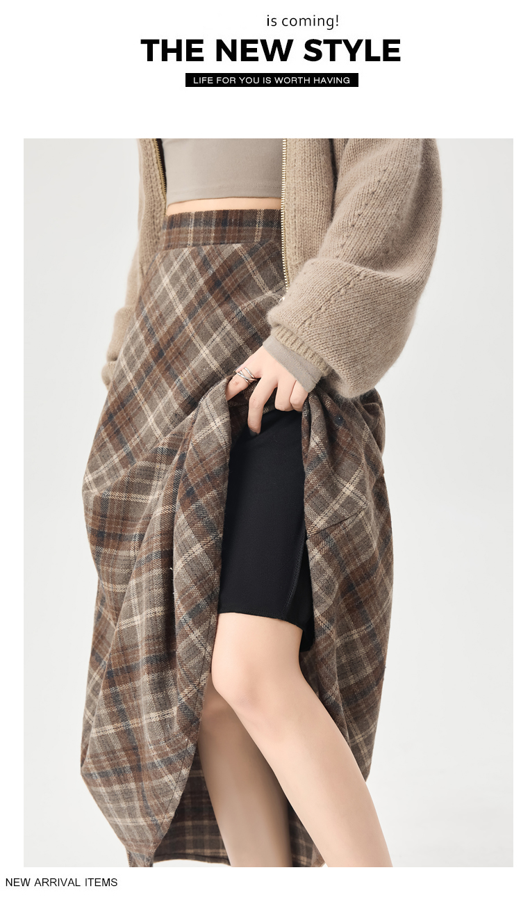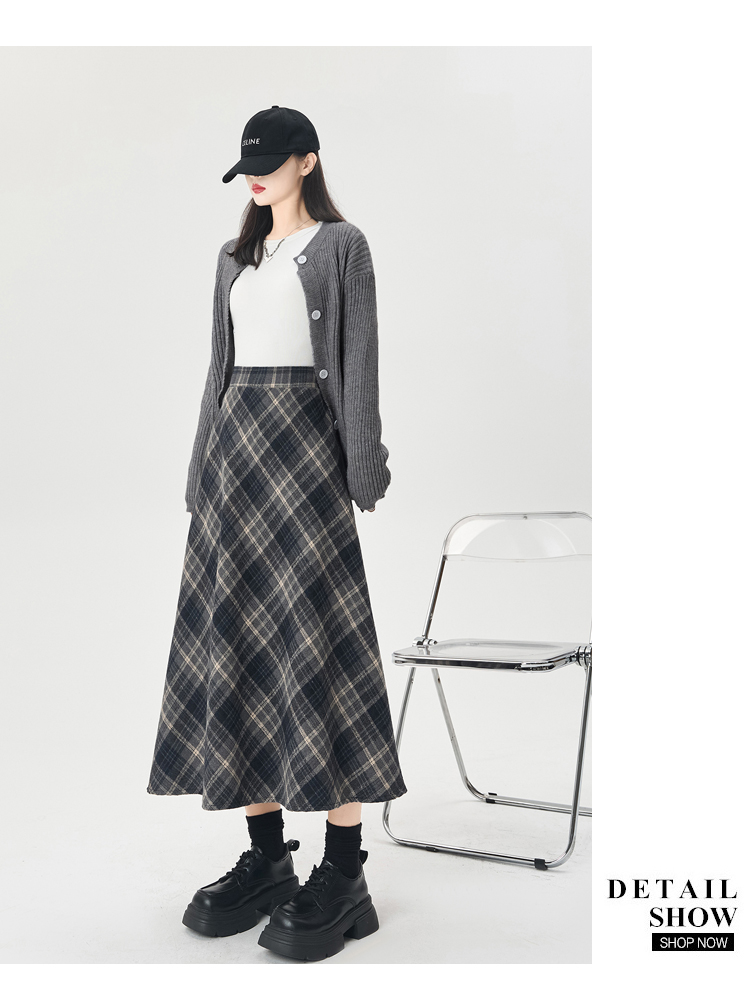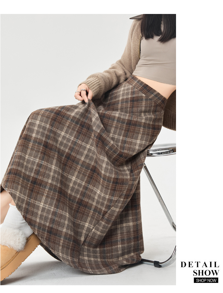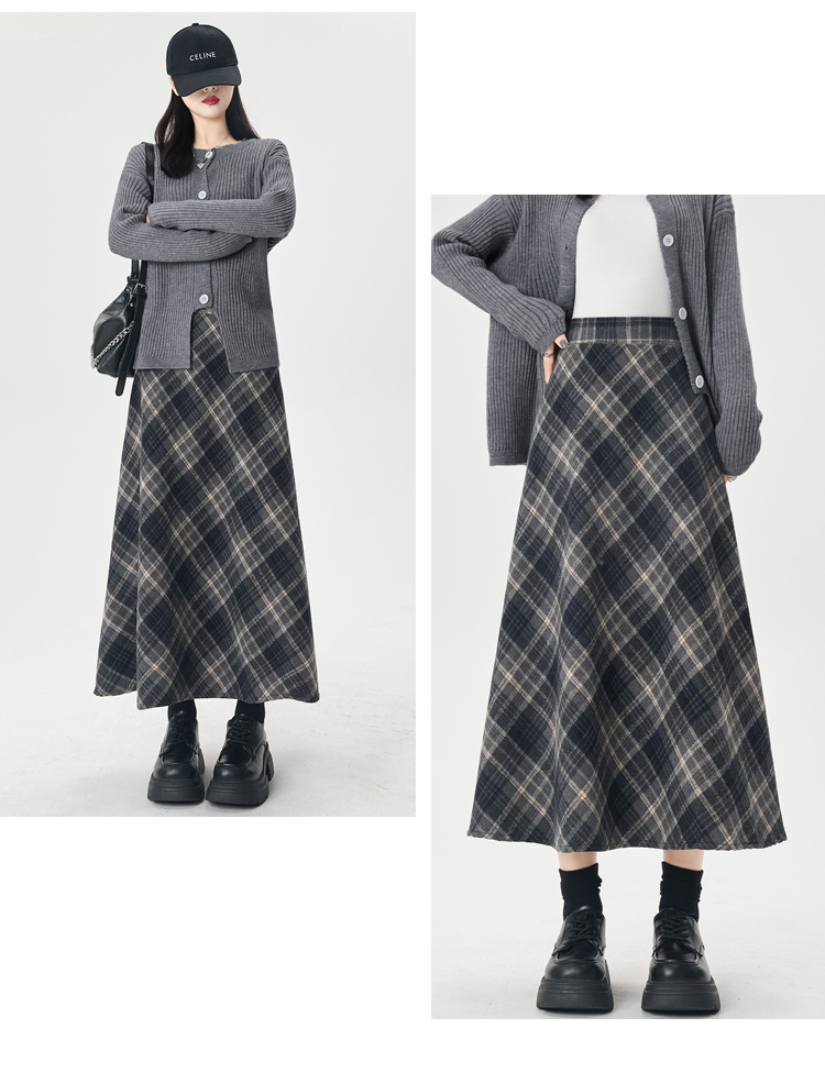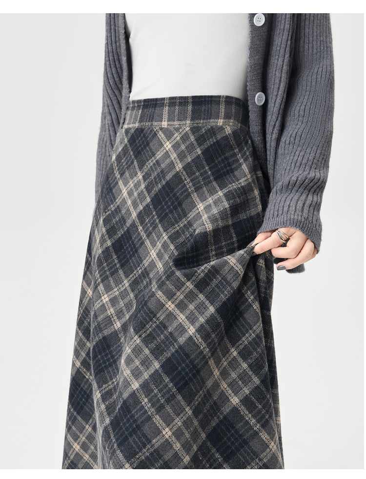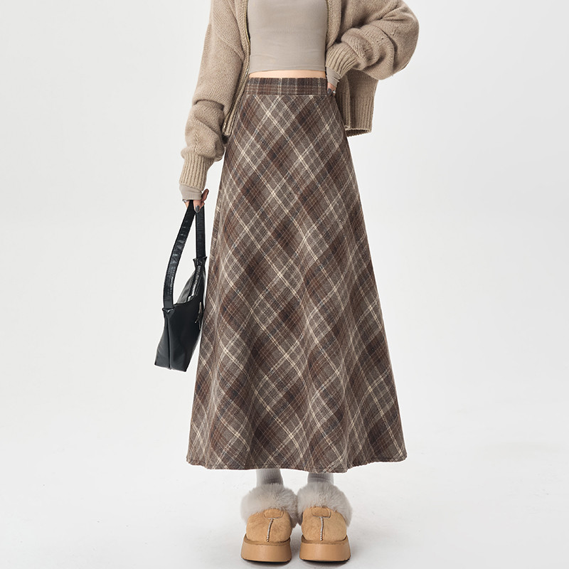 여성 A라인 플레어 모직 롱스커트 가을 겨울용 체형커버 하이웨이스트 체크스커트