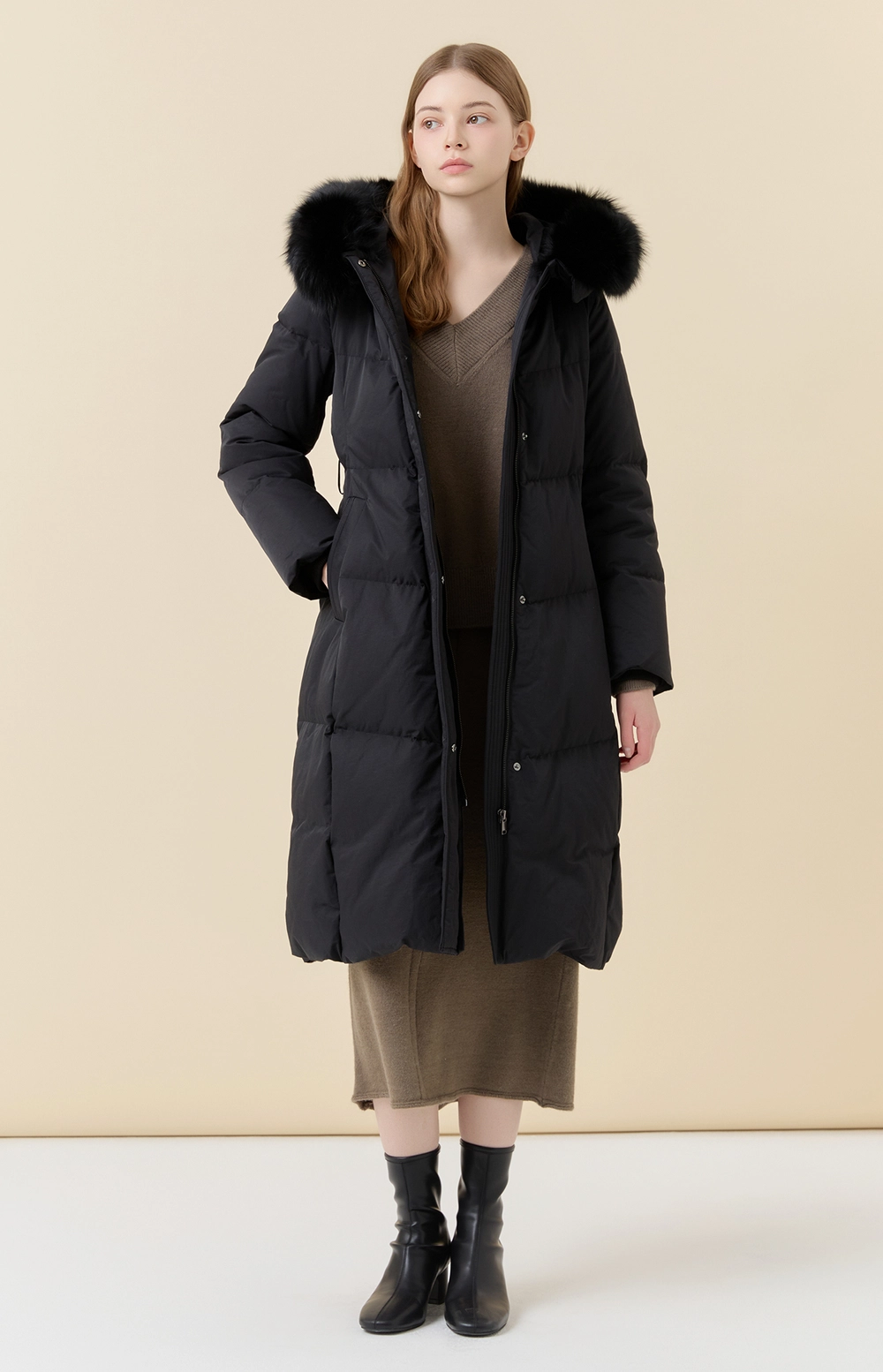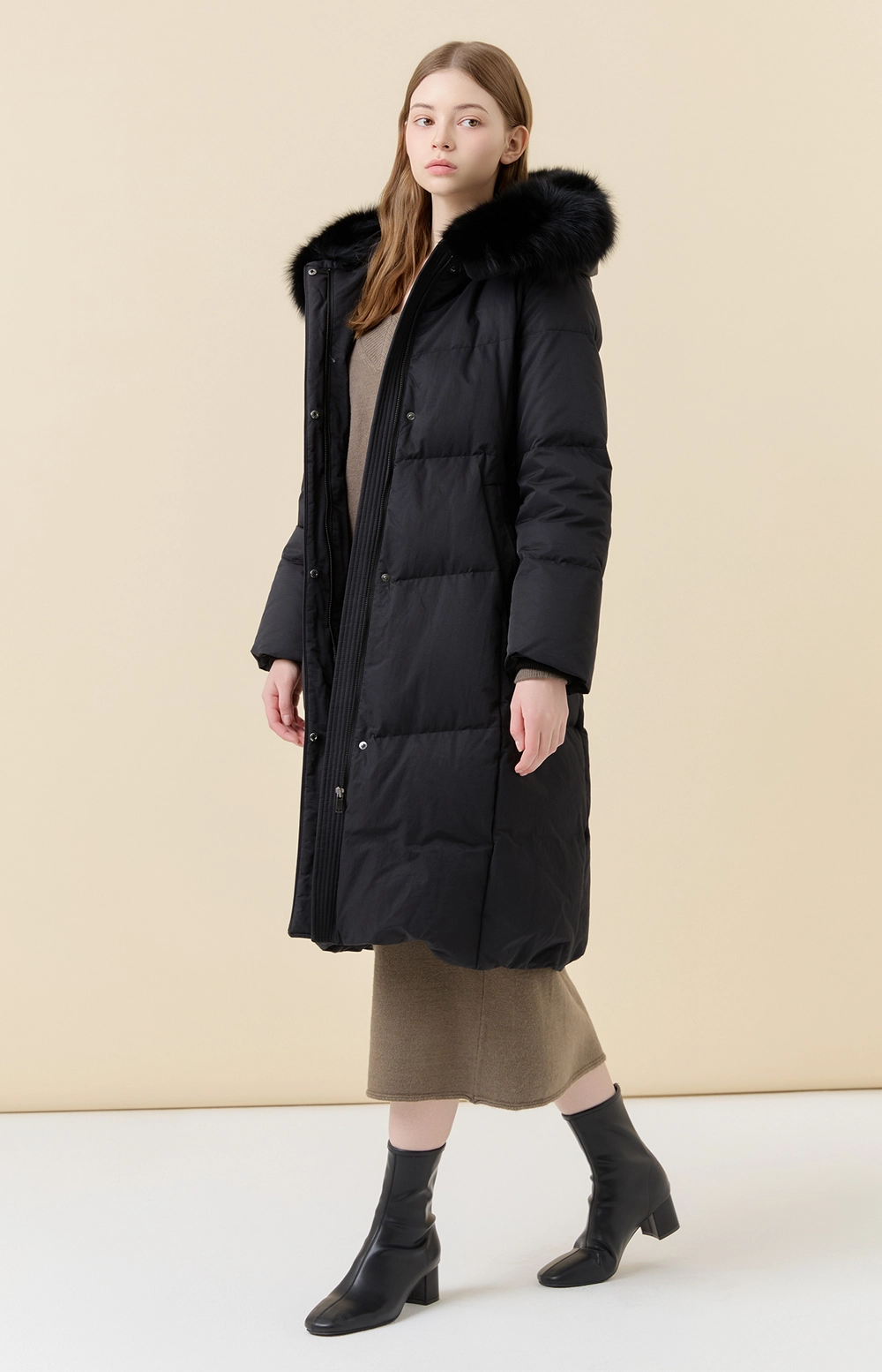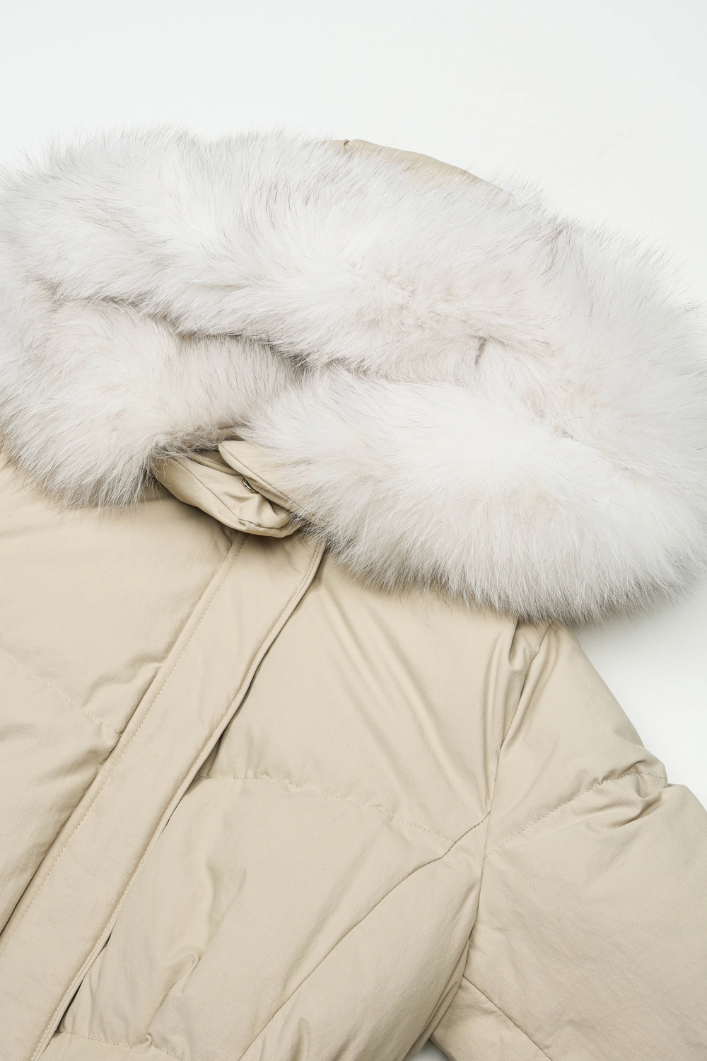 후드 디자인과 탈착 가능한 후드 폭스퍼 디테일로 포인트를 더하였습니다.