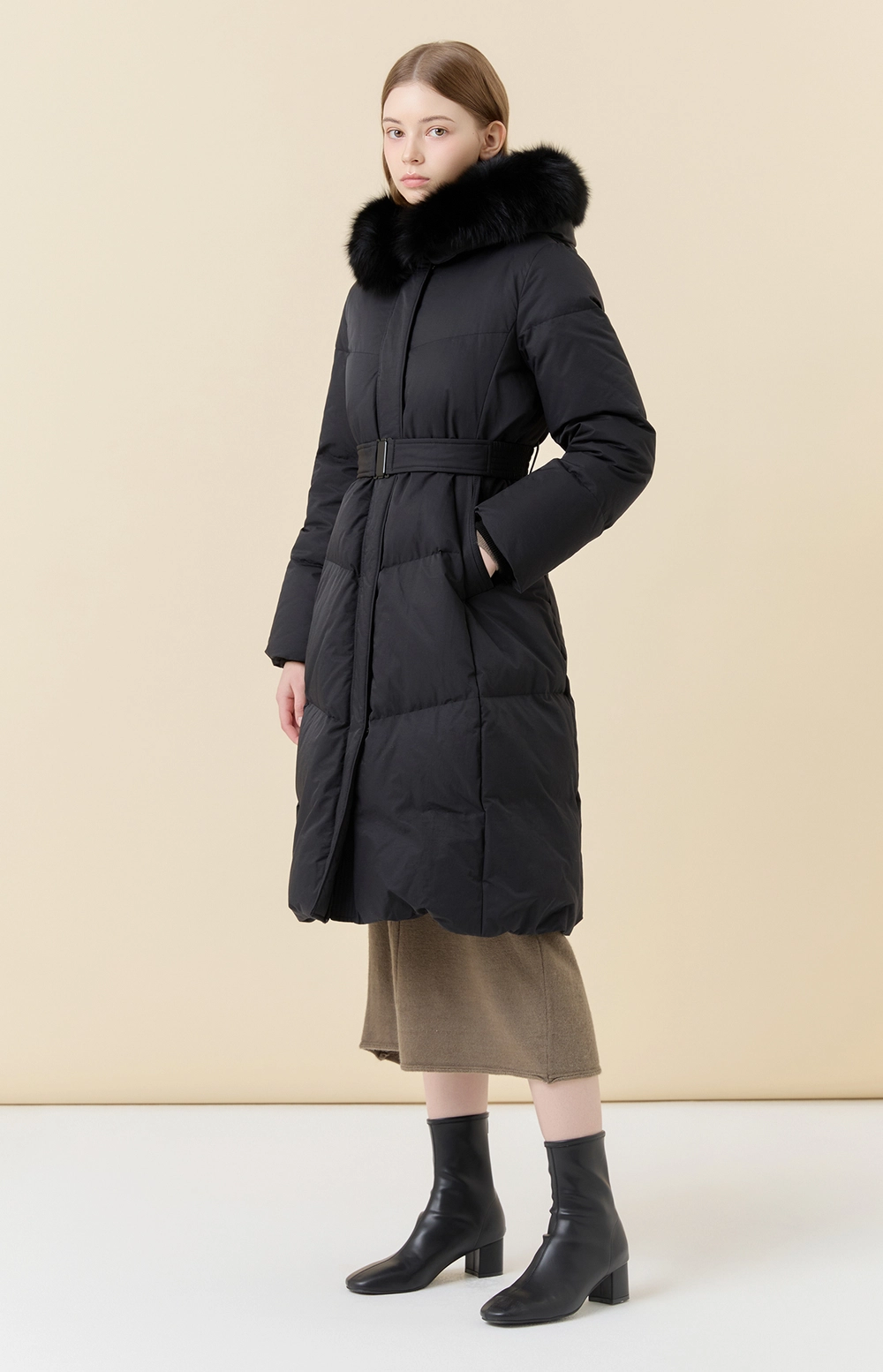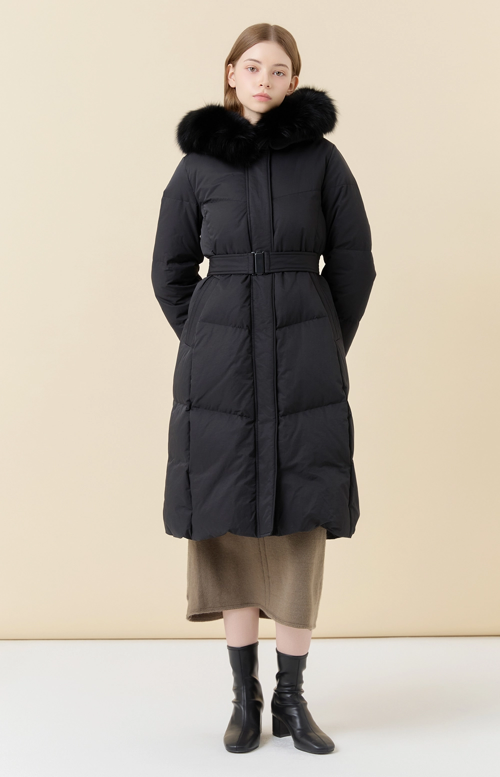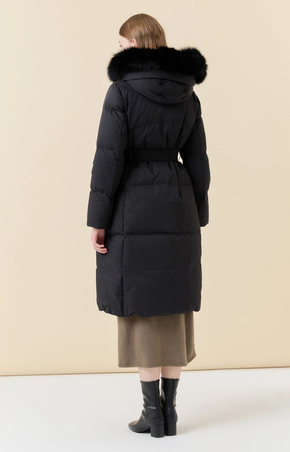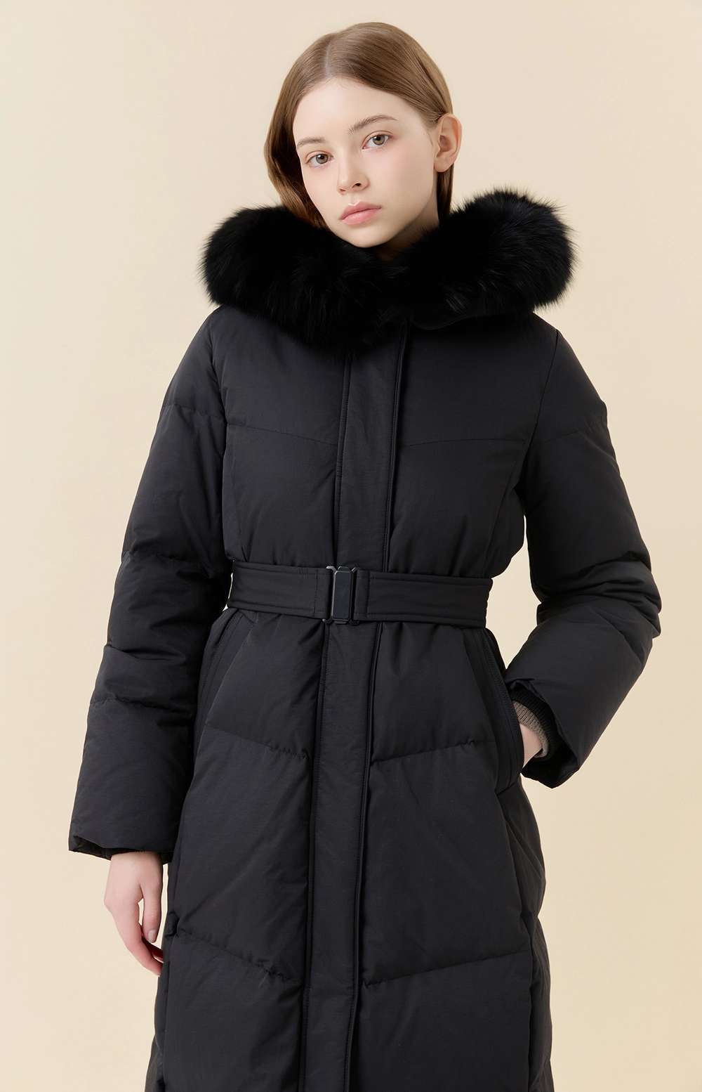 후드 디자인과 탈착 가능한 후드 폭스퍼 디테일로 포인트를 더하였습니다.