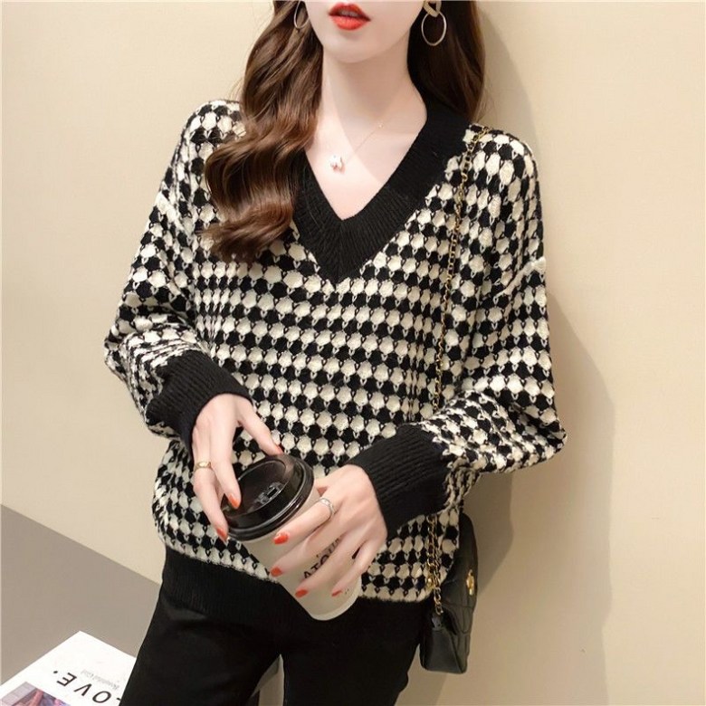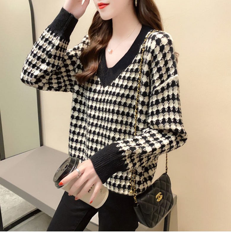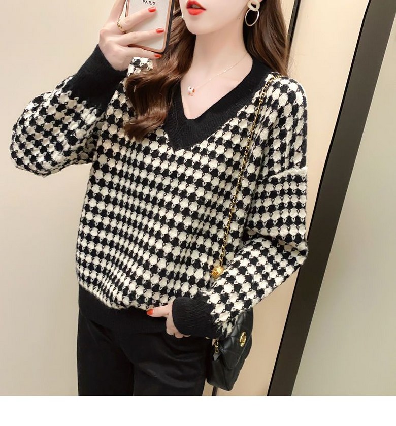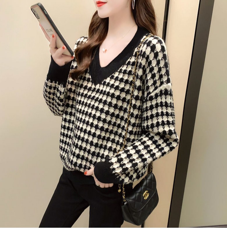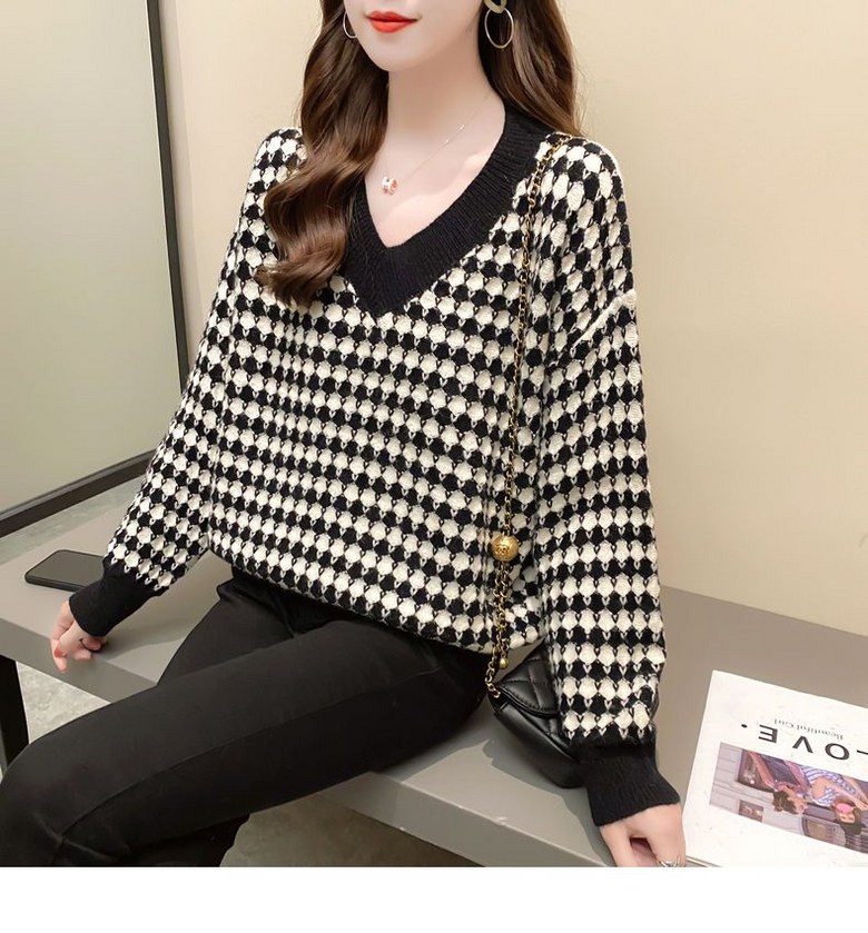날씬해보이는 특가상품 빅사이즈 여성 브이넥 루즈핏 하운드체크 니트 겨울 편한 보송 심플 패션 77 이쁜