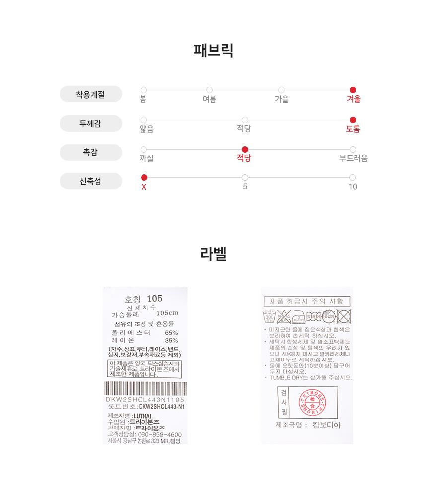 기모가 된 폴리/레이온 혼방 제품으로 착용 시 부드럽고 보온성이 좋으며