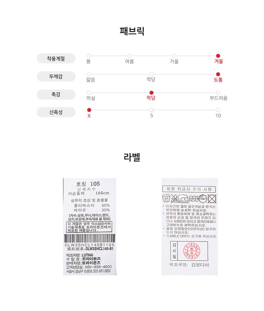 원단의 내구성과 형태 안정성을 높이고, 구김이 적어 관리가 용이한 폴리에스터를 혼방한 소재