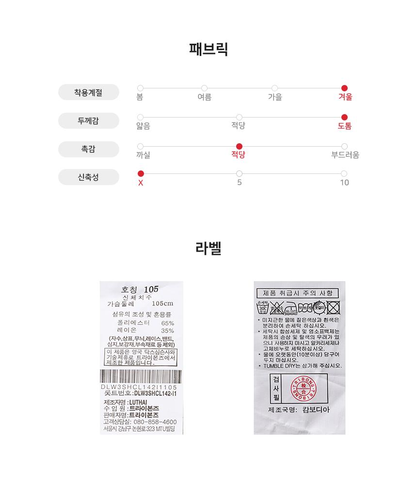 원단의 내구성과 형태 안정성을 높이고, 구김이 적어 관리가 용이한 폴리에스터를 혼방한 소재