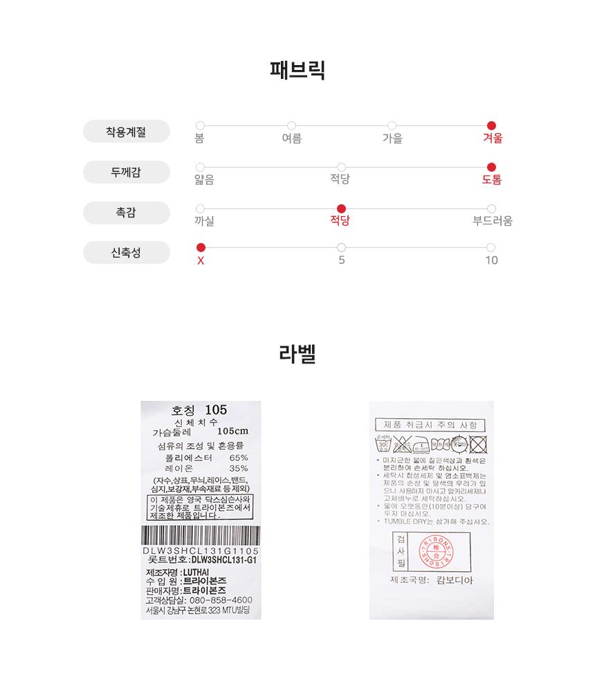 원단의 내구성과 형태 안정성을 높이고, 구김이 적어 관리가 용이한 폴리에스터를 혼방한 소재