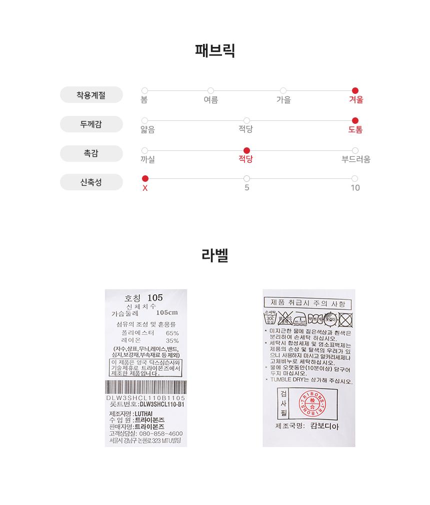원단의 내구성과 형태 안정성을 높이고, 구김이 적어 관리가 용이한 폴리에스터를 혼방한 소재