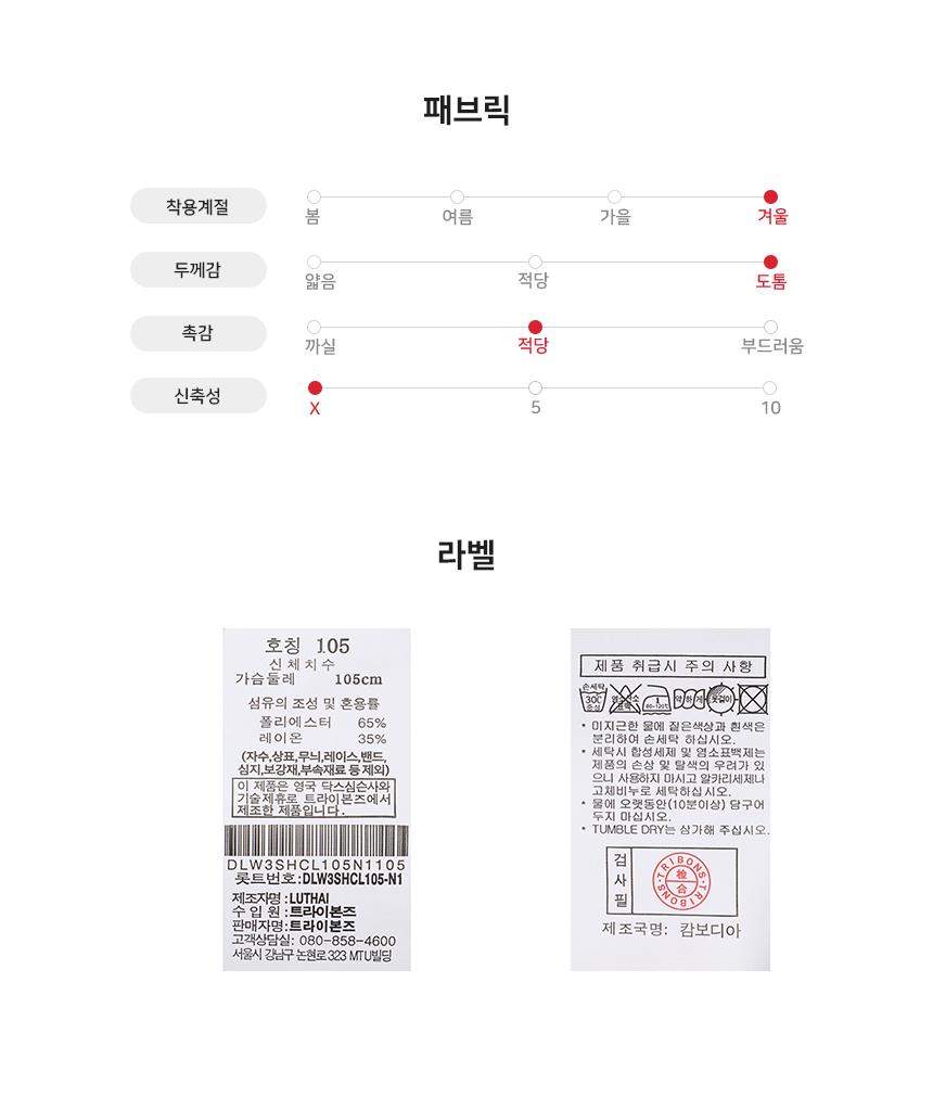 원단의 내구성과 형태 안정성을 높이고, 구김이 적어 관리가 용이한 폴리에스터를 혼방한 소재