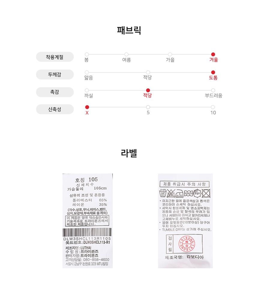 원단의 내구성과 형태 안정성을 높이고, 구김이 적어 관리가 용이한 폴리에스터를 혼방한 소재