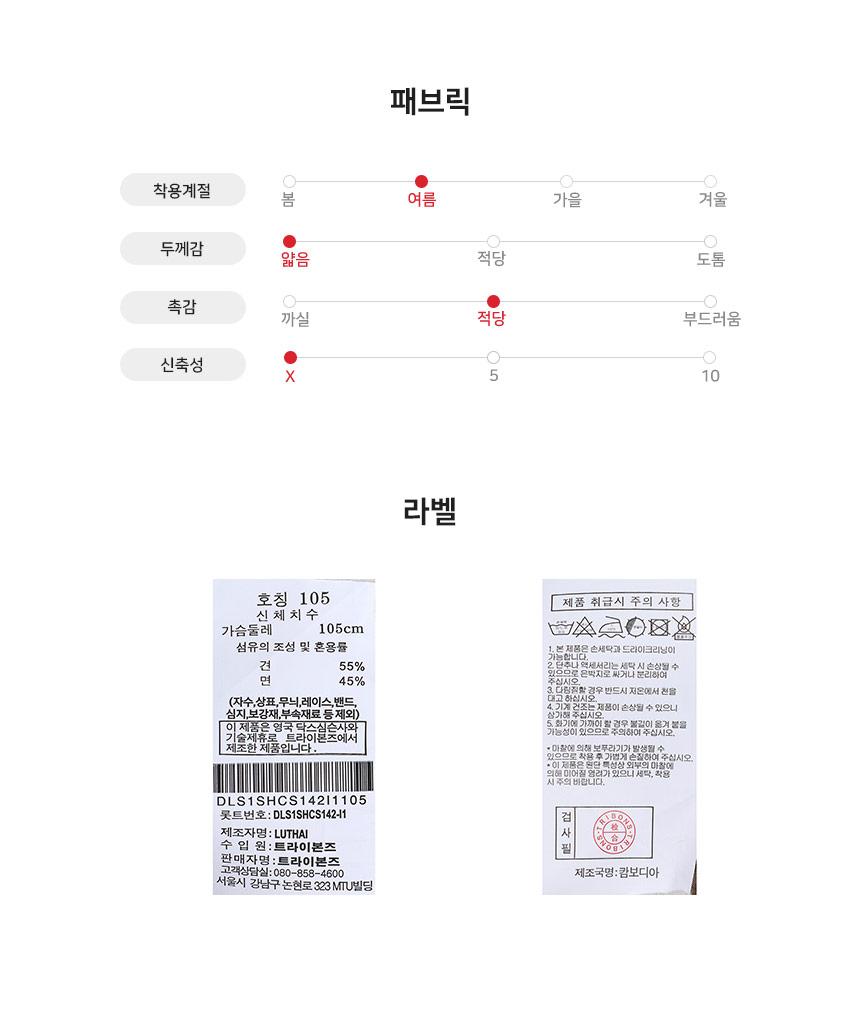 일상 착용 시 자연스러운 구김이 생기는 상품으로 세탁 후 일반/스팀 다리미로 관리해주세요.