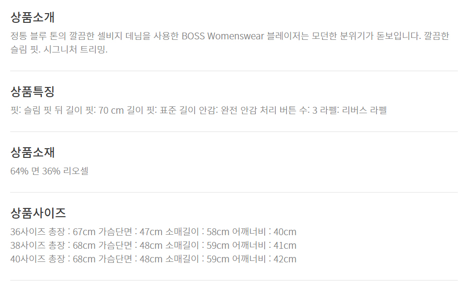 공식 보스 여성 셀비지 데님 블레이저 슬림핏 50532532_420