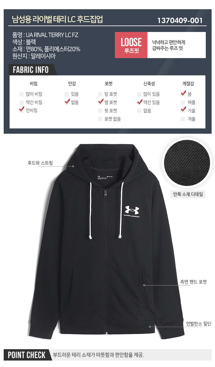 (현대Hmall)언더아머 남성용 라이벌 테리 LC 후드집업 1370409-001